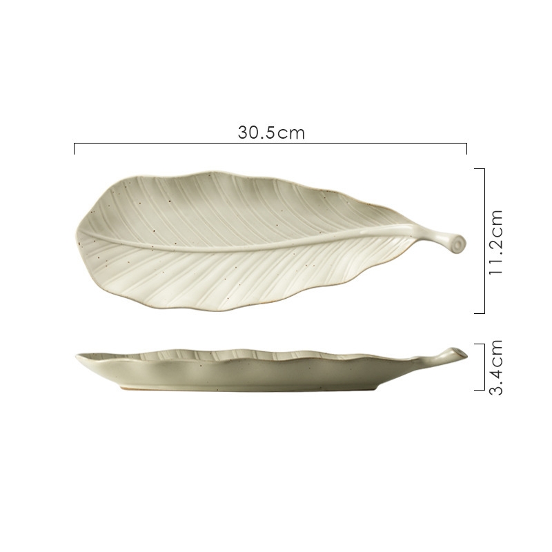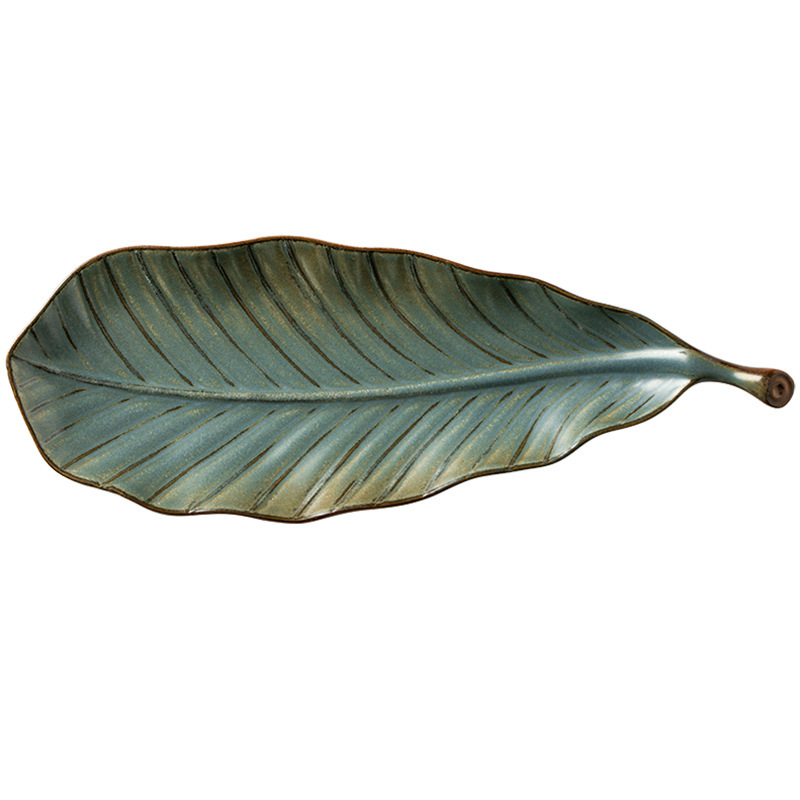 Color: Grey green leaf plate, off white leaf plate, kiln transformed red tree leaf plate, kiln transformed blue leaf plate