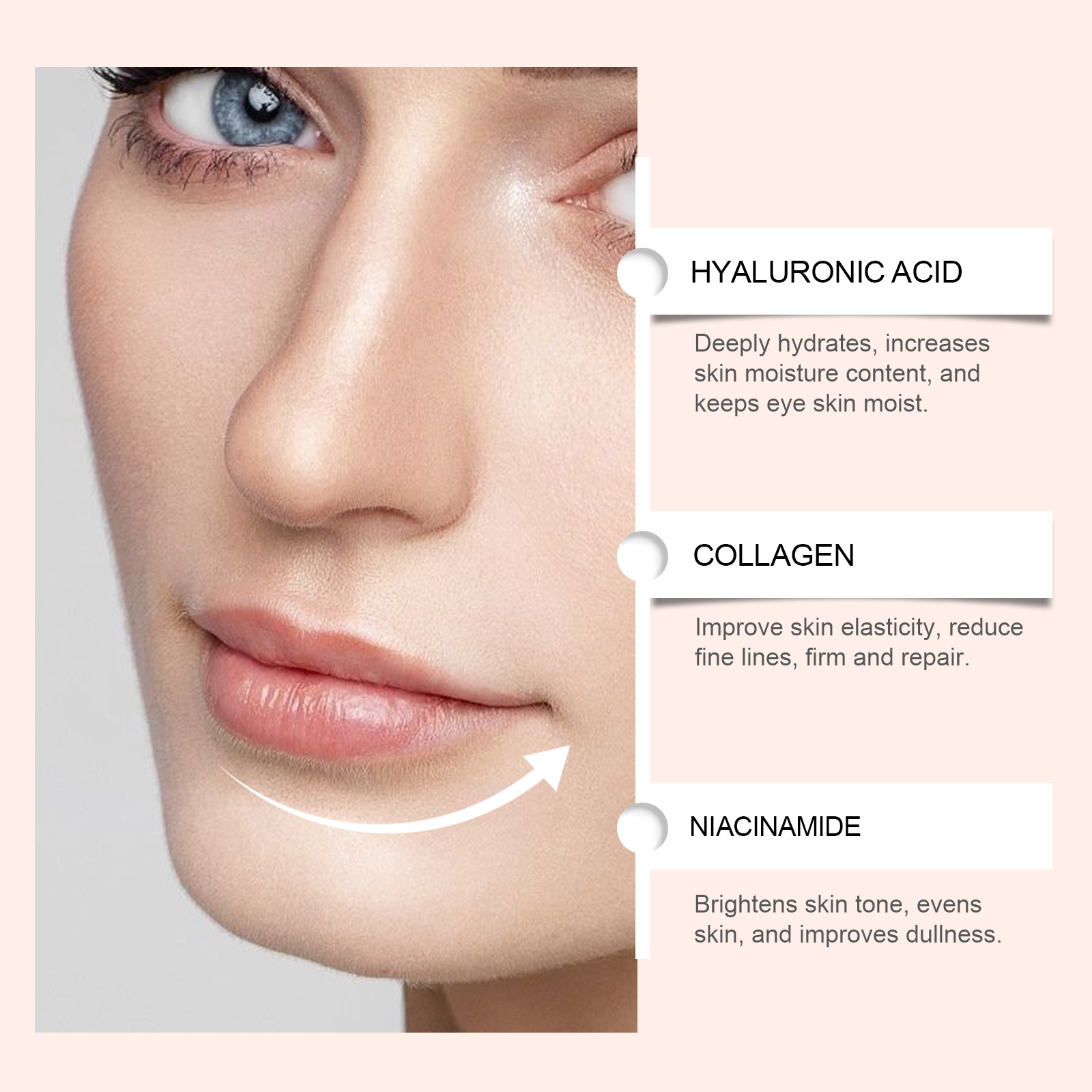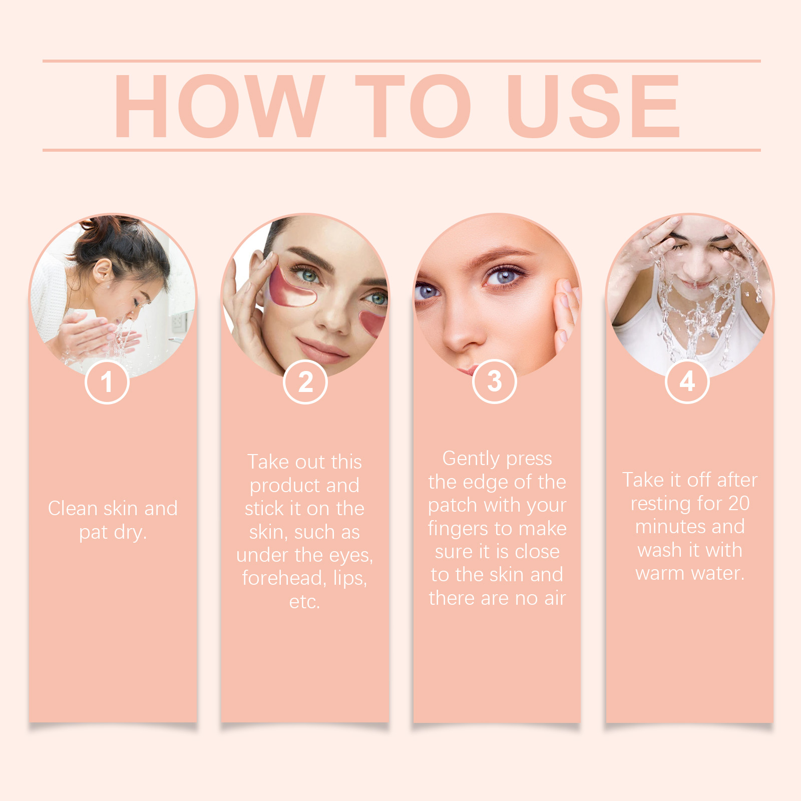 Our 5-in-1 collagen eye mask contains collagen, vitamin C, and vitamin E. It can deeply moisturize the skin, improve dryness, and bring a soft touch. Its application method is very simple: clean the skin and pat dry, remove the product, apply to the skin, under the eyes, forehead, lips, etc. Gently press the edge of the patch with your fingers to make sure it is tight to your skin, rest without air for 20 minutes, remove, and rinse with warm water. And can improve skin elasticity, reduce fine lines, firm repair.