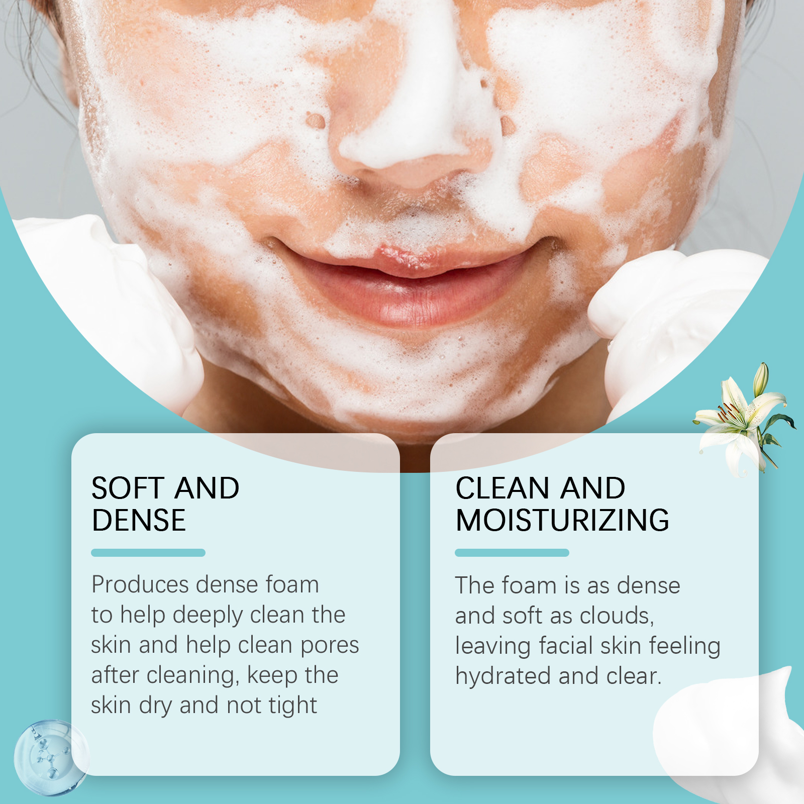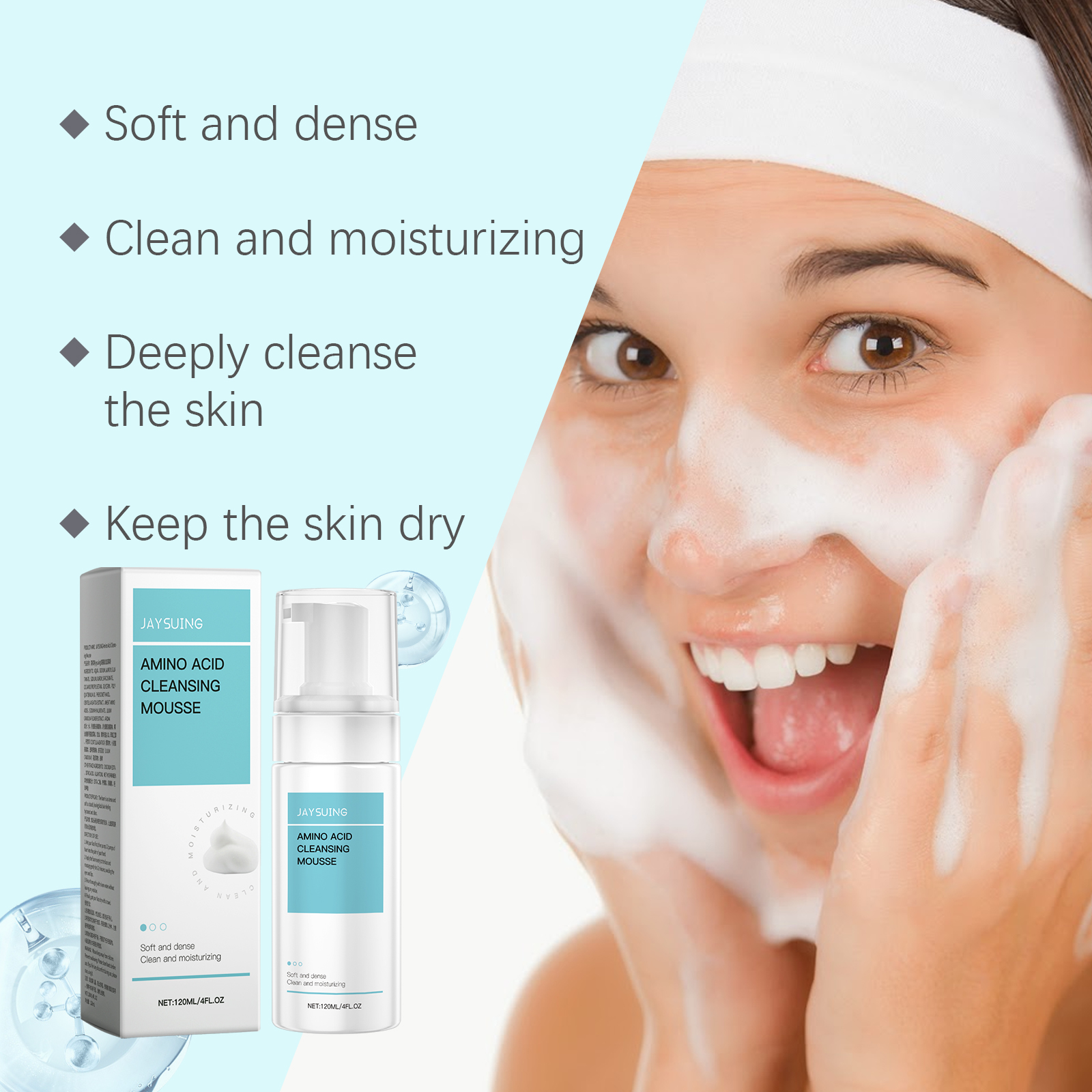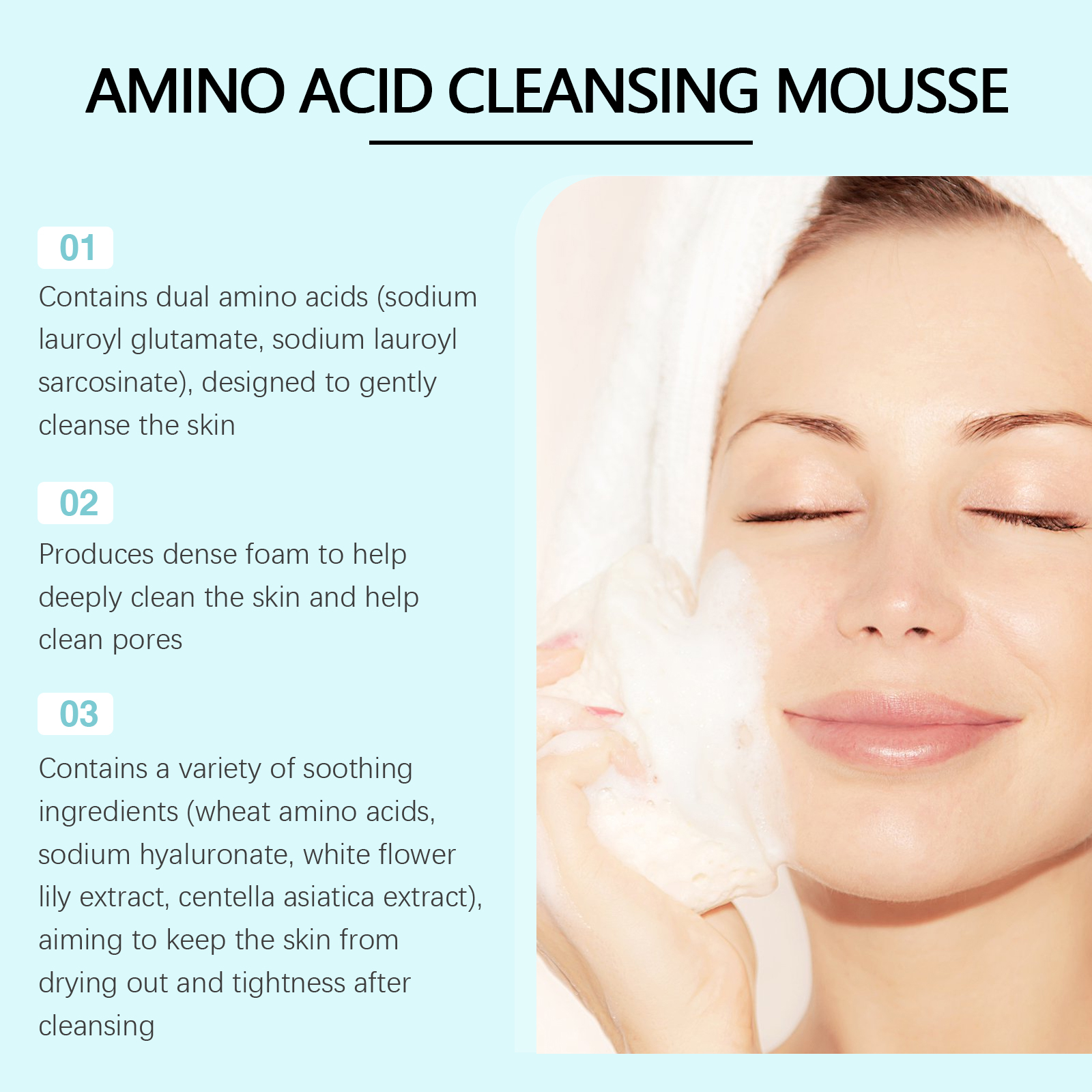 Our amino acid cleansing mousse contains sodium lauryl glutamate, sodium lauryl sarcosine, and glycerin. It can produce a dense foam, deep clean skin, clean pores, keep skin dry, not tight; The foam is as dense and soft as a cloud, leaving facial skin hydrated and transparent. Its use method is very simple: 1. Wet the facial skin with water; 2. Apply the foam to your face and massage gently for 1-2 minutes to avoid rubbing your eyes and lips. 3. Rinse thoroughly with water! Without leaving any residue, dry your face with a towel. Amino Acid Cleansing mousse contains two amino acids (sodium lauryl glutamate, sodium lauryl sarcosine) and is designed to gently cleanse the skin.