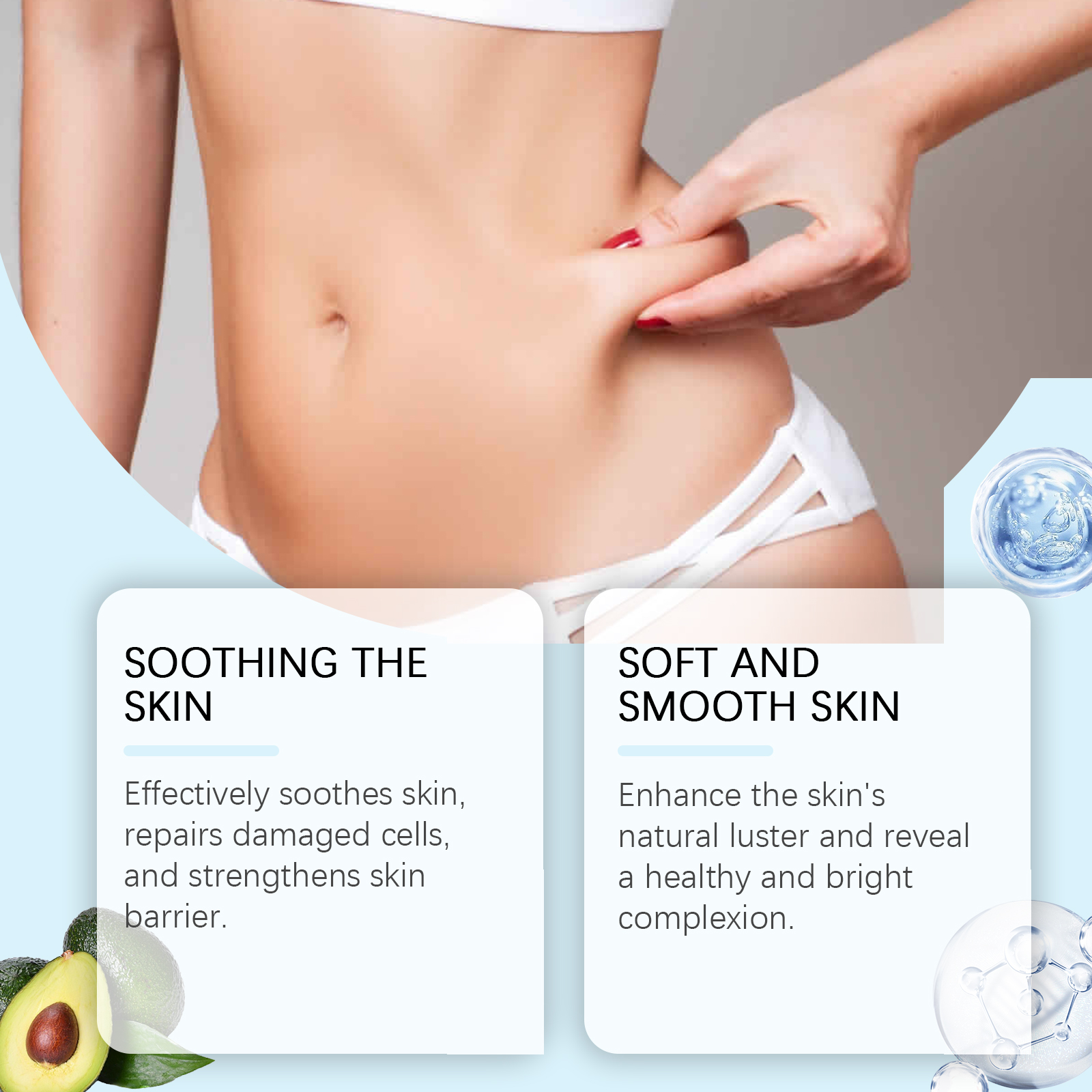 Our anti-wrinkle firming and brightening Body lotion contains tripeptide-1, avocado extract, and ascorbic acid (vitamin C). It can effectively soothe the skin. Repair damaged cells and strengthen the skin barrier. Enhances skin's natural glow for a healthy, bright complexion. The way to use it is very simple: 1. Thoroughly clean the skin and dry it first. 2. Apply proper amount of the product to the whole body. 3. Gently massage until fully absorbed. Light texture, fast absorption, non-greasy, easy to use daily. Improve skin tone and texture, enhance skin confidence, and show beauty.