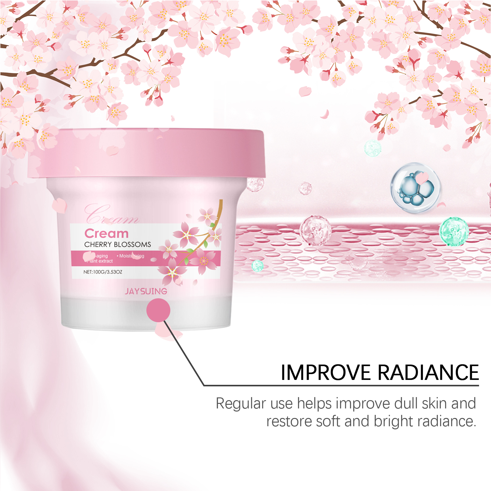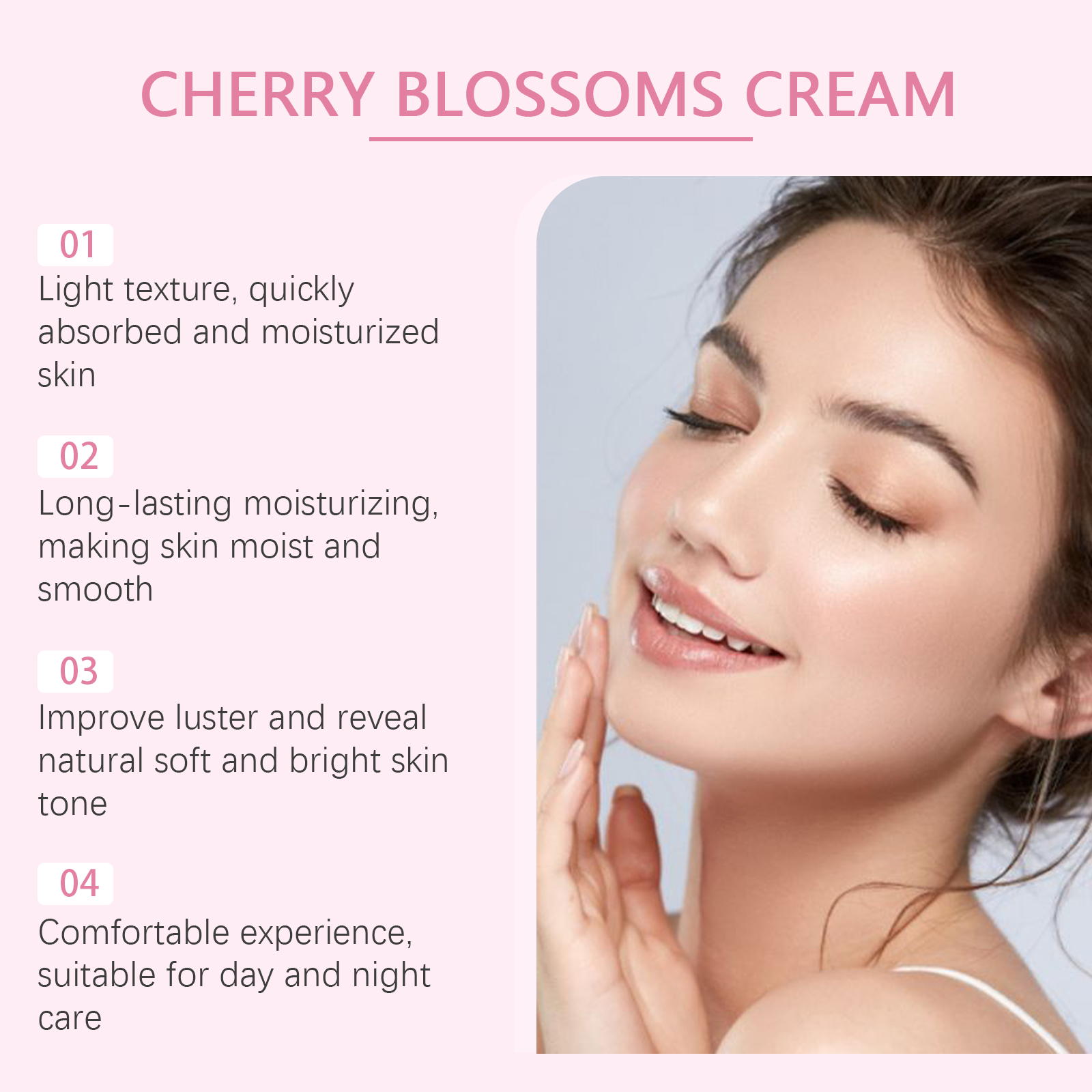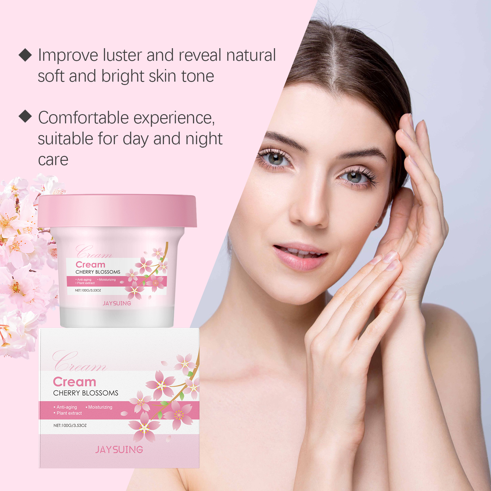 Our cherry blossom Moisturizing cream contains cherry blossom extract, glycerin, tocopherol. It can easily penetrate the surface of the skin to help replenish the moisture needed by the skin and keep the skin hydrated. Its application method is very simple: 1. Please clean your face before use to ensure that your skin is clean. 2. Use clean fingers to apply the cream to your forehead, cheeks, nose and chin. 3. Massage gently with your fingertips for a few minutes to promote absorption. Regular use helps to improve dull skin and keep it soft and bright.