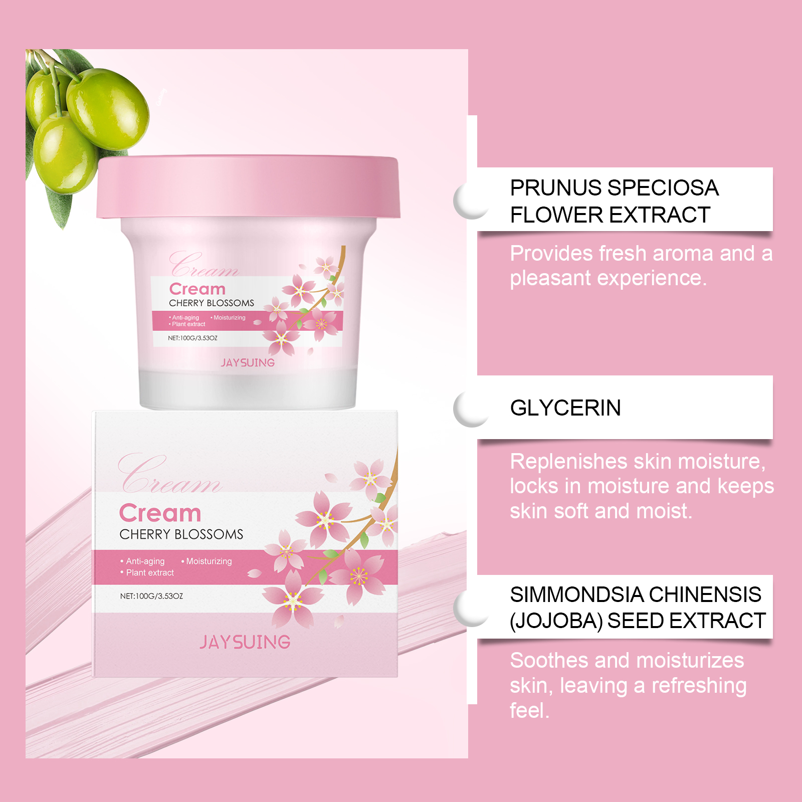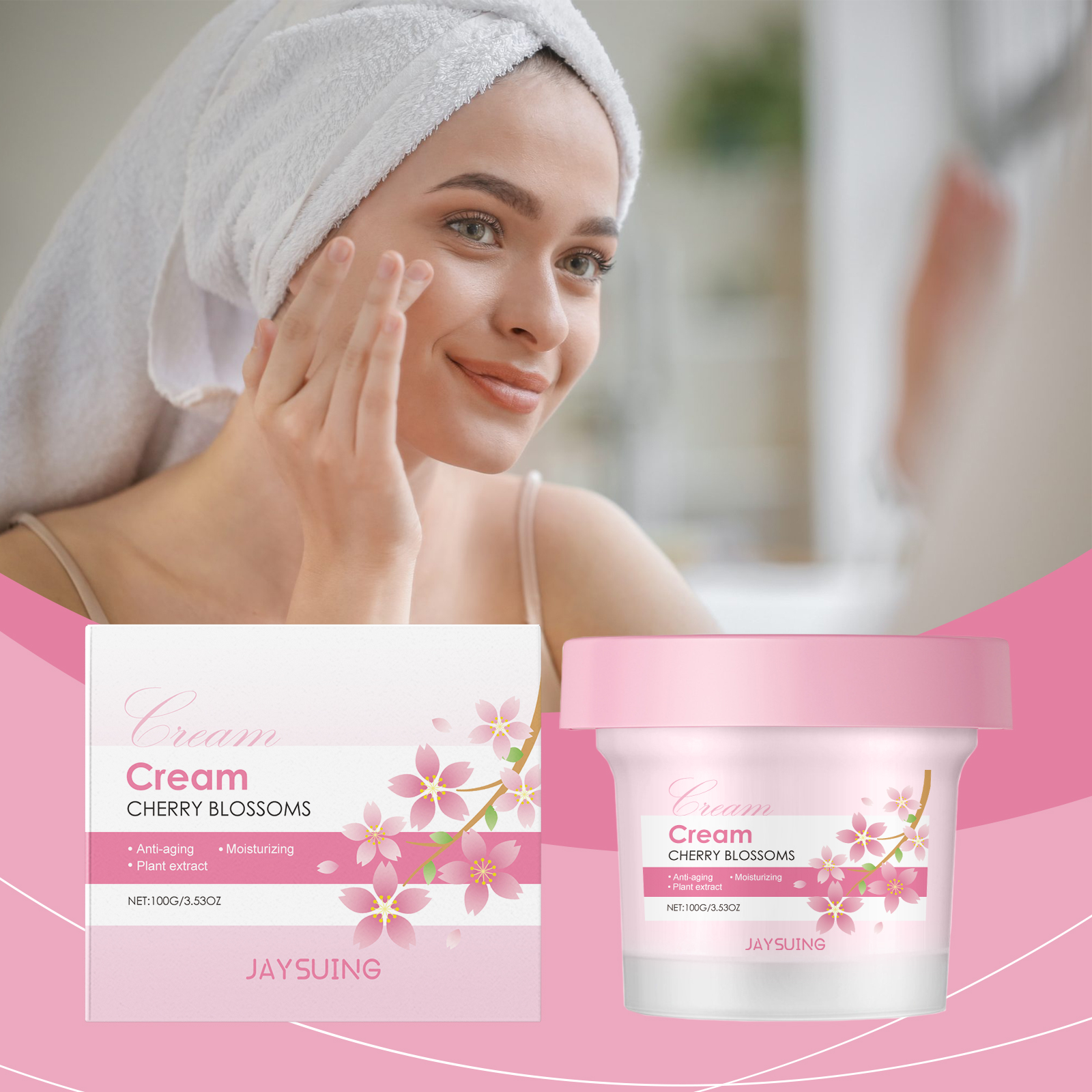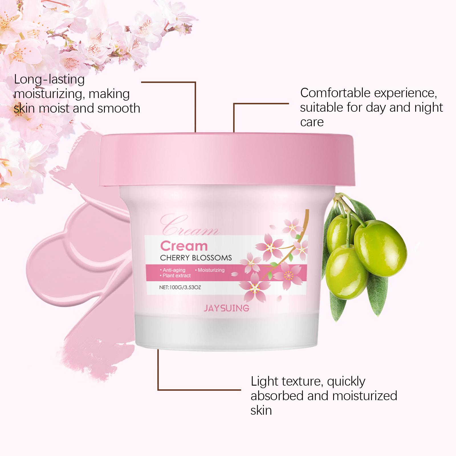 Our cherry blossom Moisturizing cream contains cherry blossom extract, glycerin, tocopherol. It can easily penetrate the surface of the skin to help replenish the moisture needed by the skin and keep the skin hydrated. Its application method is very simple: 1. Please clean your face before use to ensure that your skin is clean. 2. Use clean fingers to apply the cream to your forehead, cheeks, nose and chin. 3. Massage gently with your fingertips for a few minutes to promote absorption. Regular use helps to improve dull skin and keep it soft and bright.