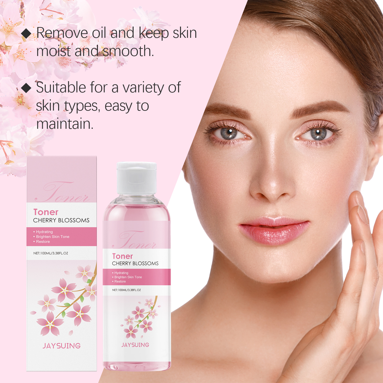 Our cherry Blossom Hydrating toner contains cherry blossom extract, glycerin, and soy amino acids. It gently tones the skin, helping to reduce pores and make the skin more delicate. Its application method is simple: 1. Clean and dry facial skin. 2. Apply proper amount of this product to the palm and evenly apply to the face. Pat gently until absorbed. Keep skin hydrated and soft and smooth at all times.