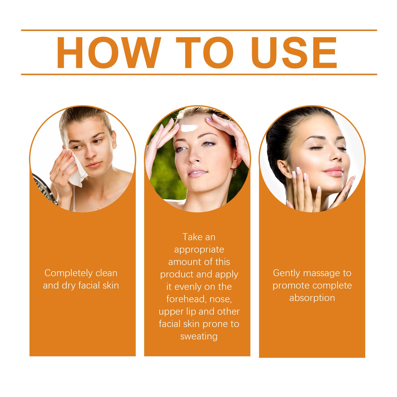 Our facial lotion contains niacinamide, oat extract. It soothes the skin and reduces discomfort caused by sweating using gentle ingredients suitable for people with all skin types. Its use method is very simple: thoroughly clean dry facial skin, evenly apply appropriate amount of this product to forehead, nose, upper lip and other facial skin prone to sweat, gently massage to promote complete absorption. And can be light texture, absorption fast without greasy feeling.