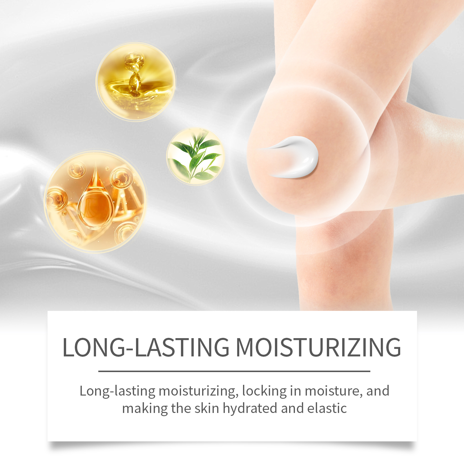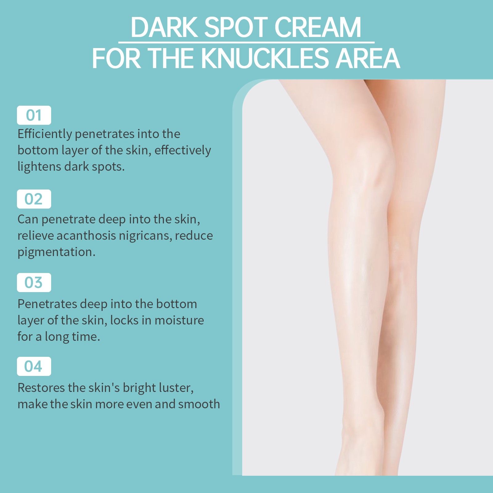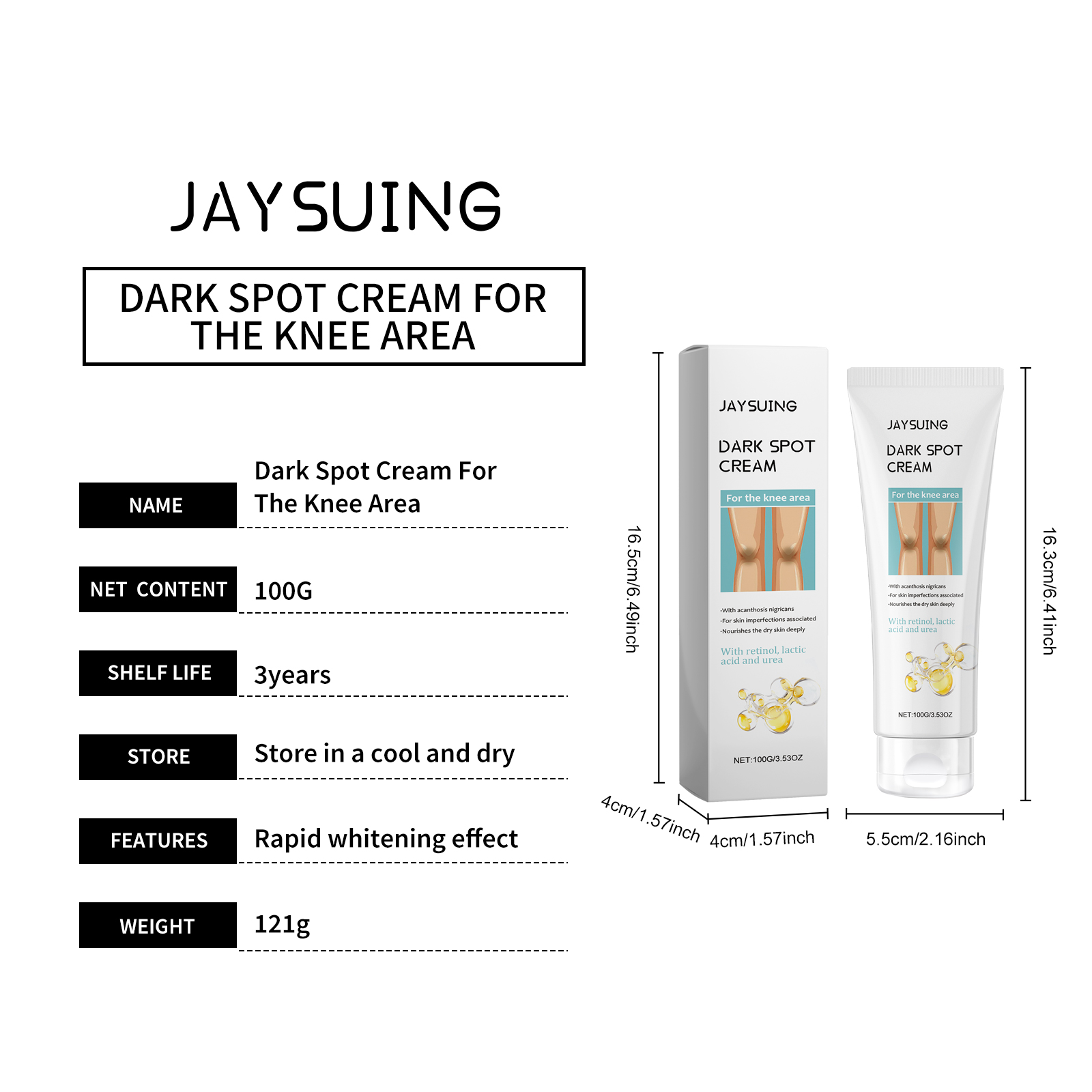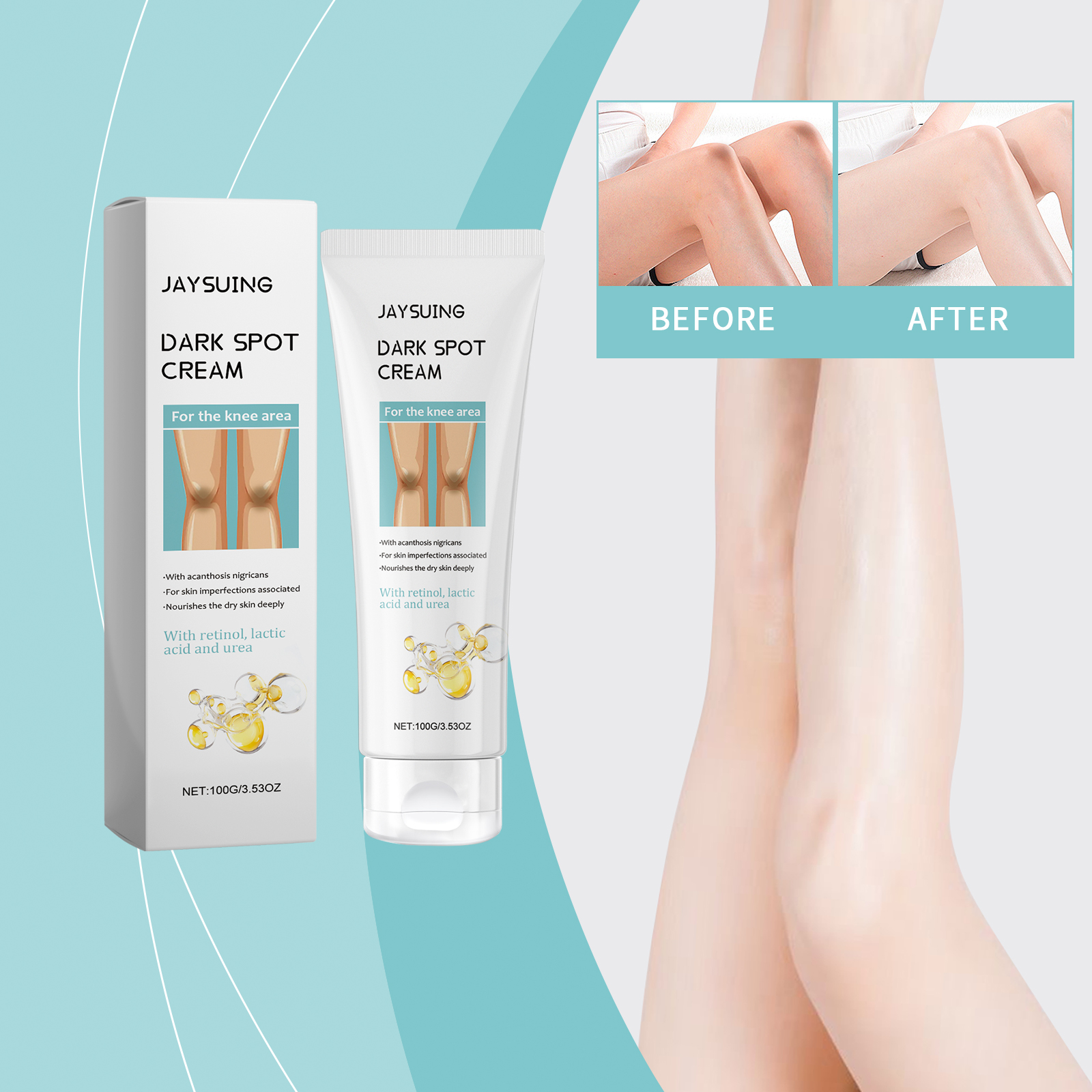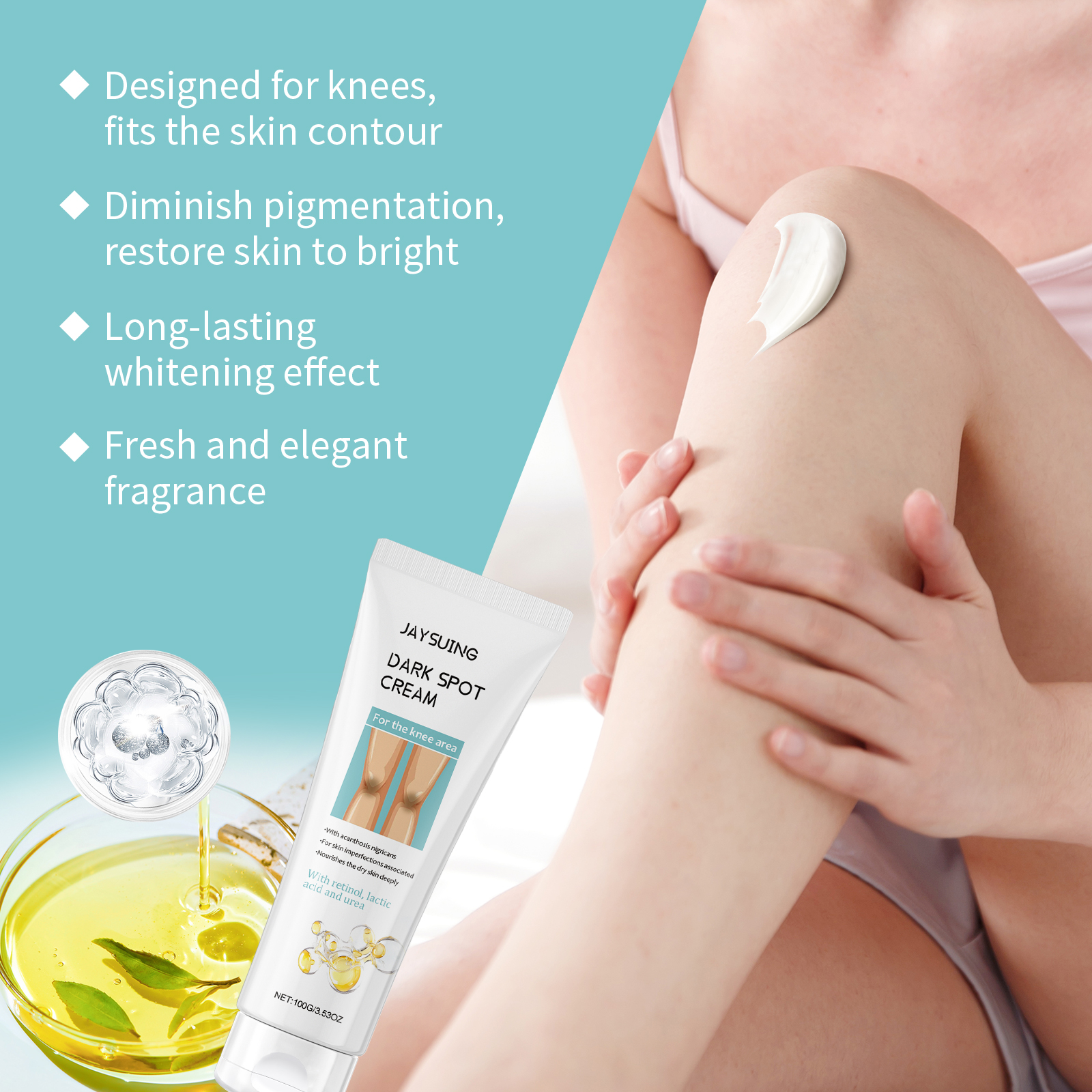 Our knee whitening cream contains lactic acid, retinol. It moisturizes for a long time, locks in moisture, and leaves skin hydrated and elastic. The way to apply it is simple: clean the skin on and around your knees, keep it dry, squeeze out the right amount of cream and apply it evenly to your knees. Massage gently in circular motions to promote absorption. And can repair by deep nourishment, a damaged skin, glow natural glow.
