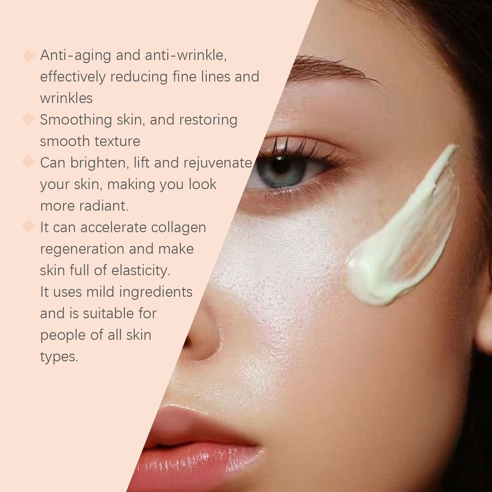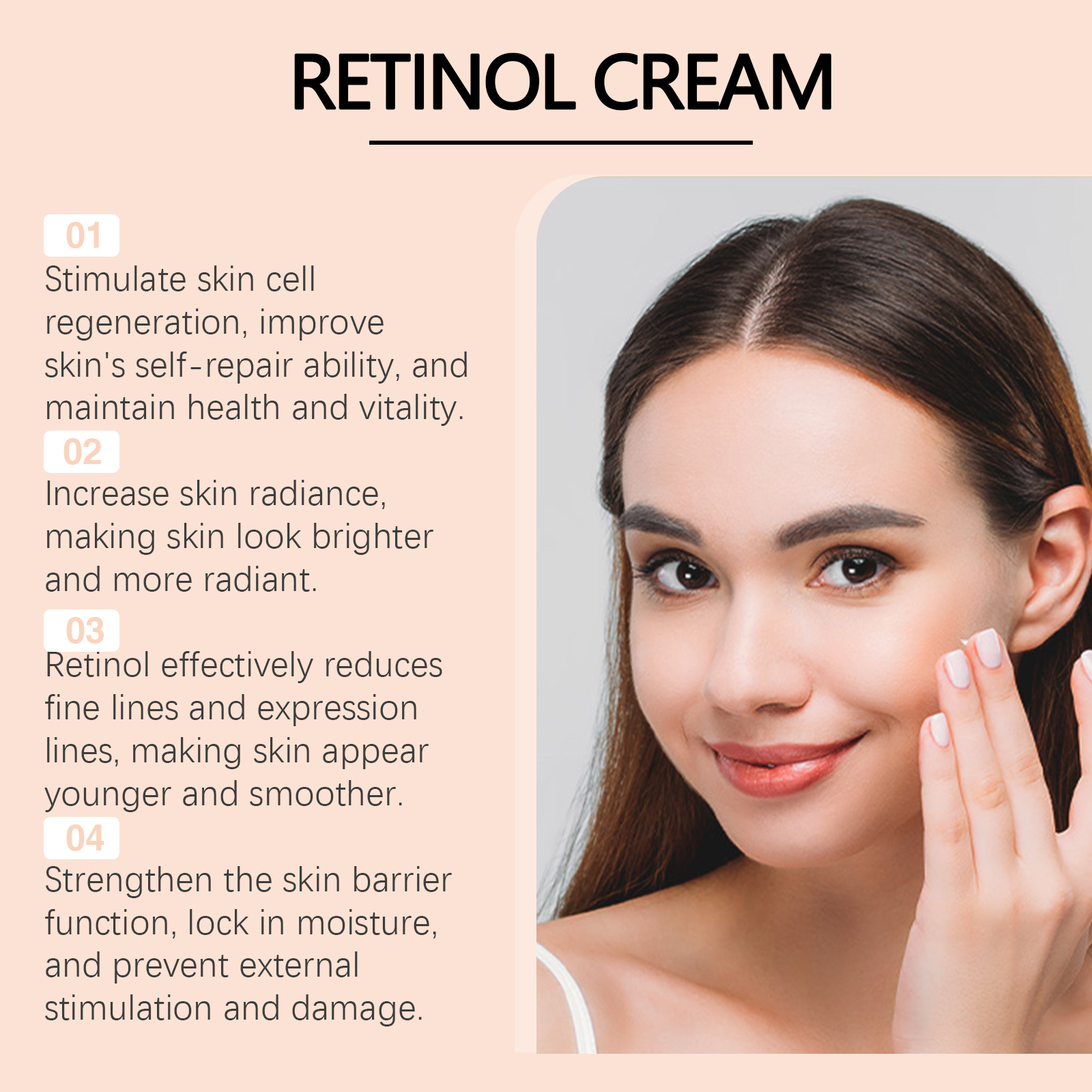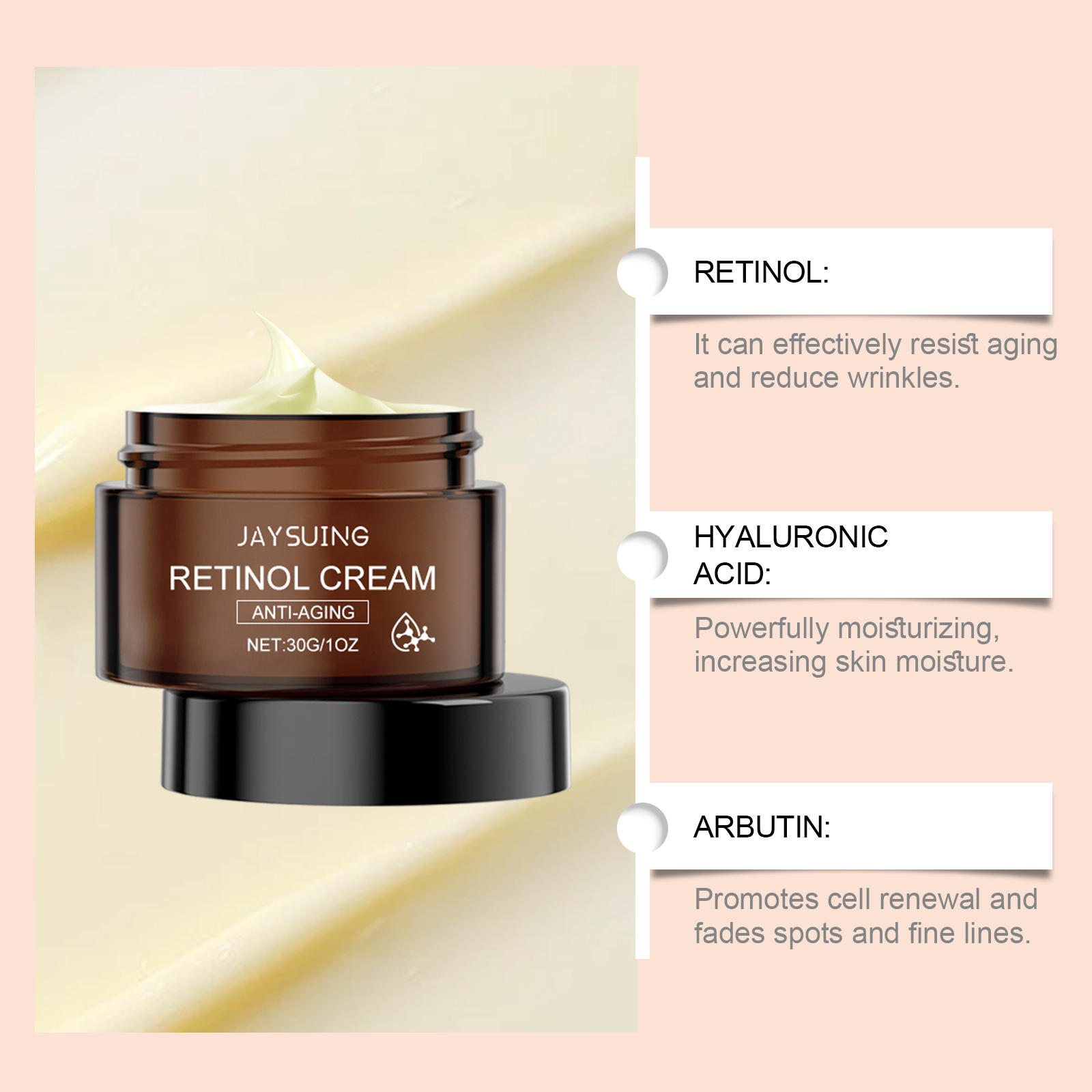 Our retinol moisturizing anti-wrinkle cream contains retinol, arbutin, Paeonia root extract. It can deeply nourish the skin and enhance skin elasticity and firmness. Retinol effectively reduces fine lines and wrinkles and slows the skin aging process. Its application method is very simple: 1. Thoroughly clean the skin, dry it first; 2. Apply appropriate amount of the product evenly on the face; 3. Gently massage until fully absorbed. Hyaluronic acid provides a long-lasting moisturizing effect that keeps skin hydrated and full and prevents dryness.