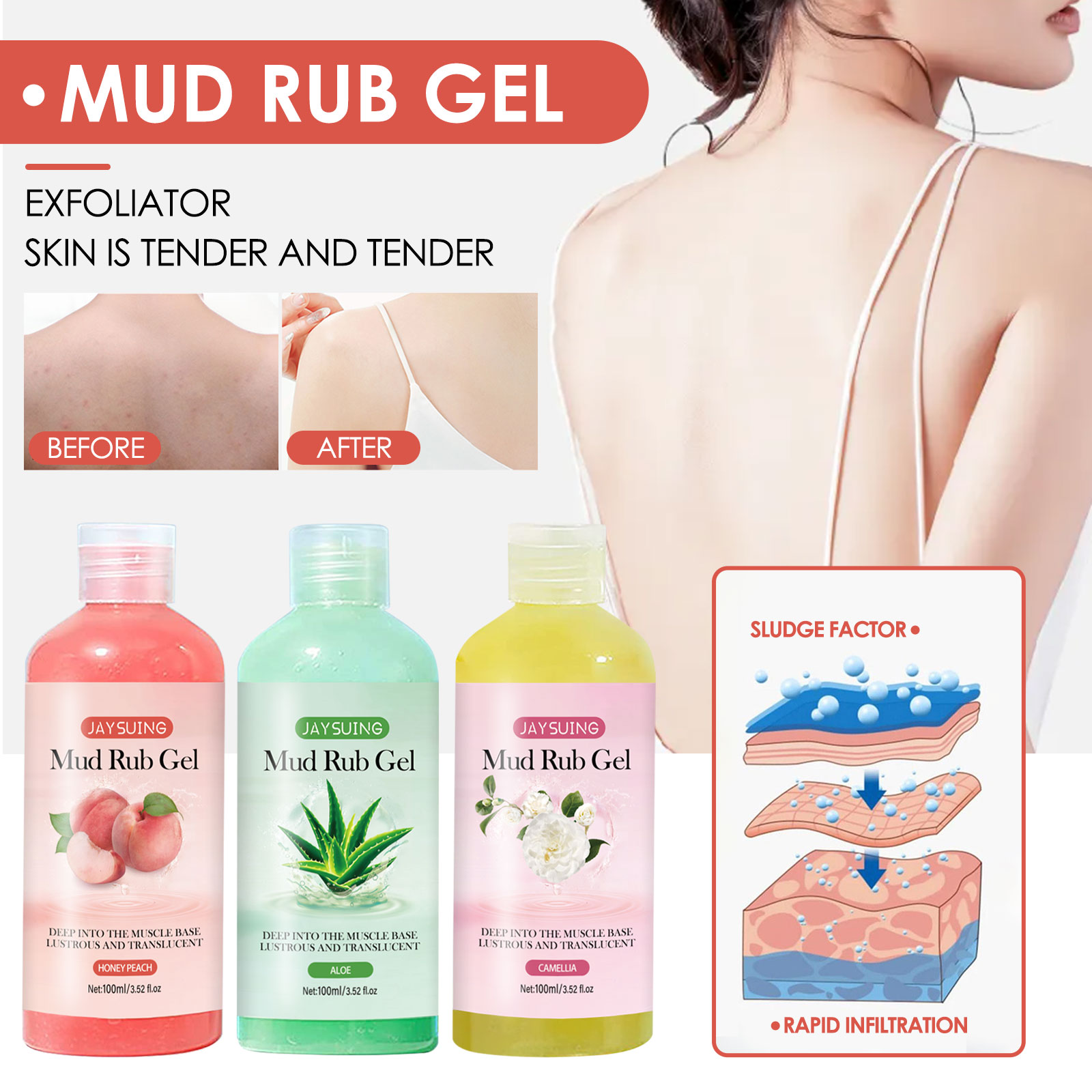 Our Clay cream contains peach essence, aloe vera essence, camellia essential oil. It can quickly enter the grooves and pores of the epidermis, suction out oil and dead skin, deep into the bottom of the muscle shine. Its use is simple: take about 5ml, squeeze into the desired area, massage in a circular motion until thoroughly cleaned, and then rinse with water. Body skin clean, soft and smooth skin, exfoliating and dead skin, brightening and refreshing skin.