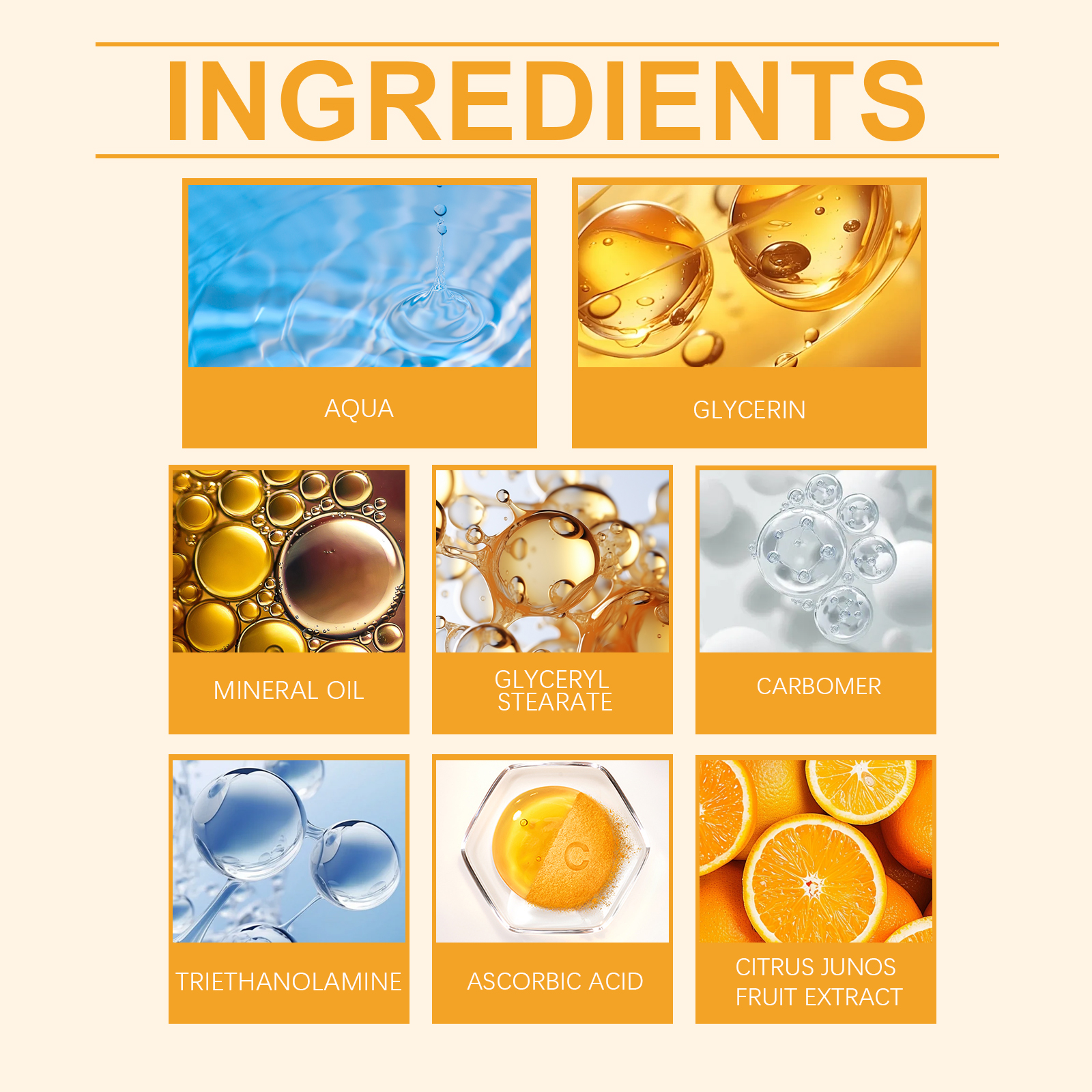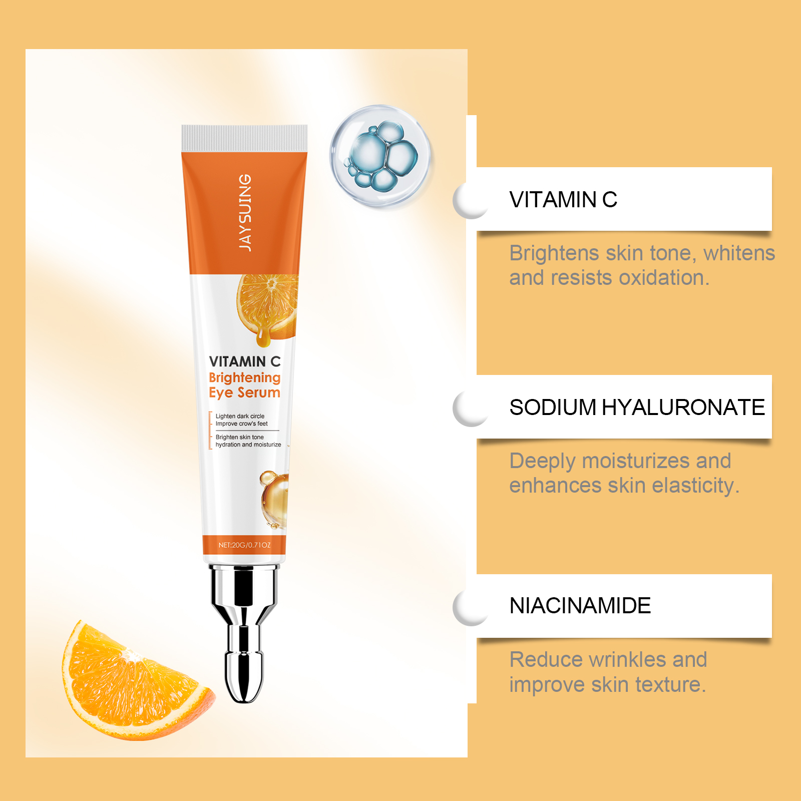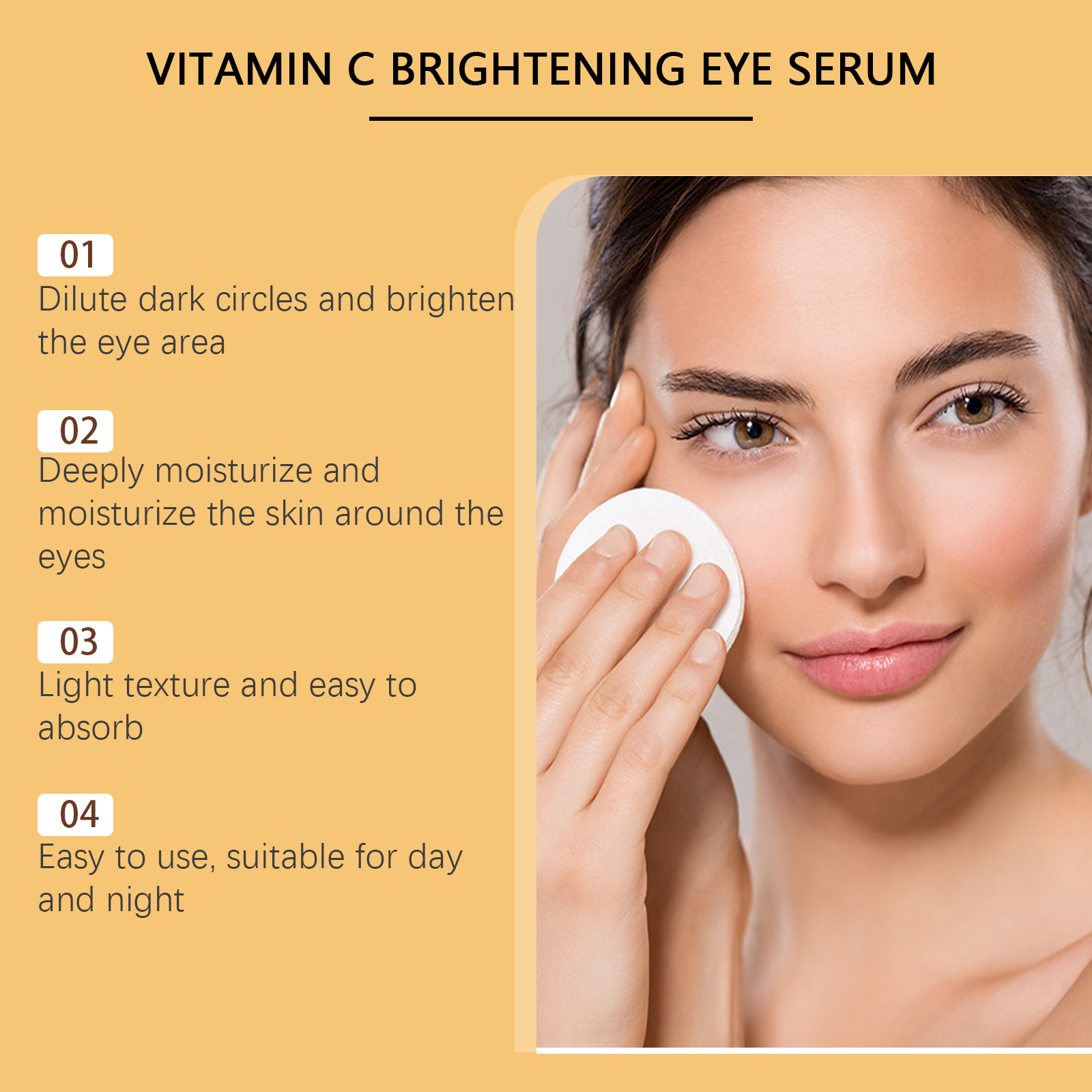 Our vitamin C eye cream is carefully formulated with carbomer and triethanolamine. Specially designed to make the skin around the eyes soft and smooth, reducing dryness and fine lines. The usage method is extremely convenient: After cleansing your face in the morning and evening every day, take an appropriate amount of eye cream and gently apply it around the eyes. Use your ring finger to gently massage until it is fully absorbed. And it can brighten the skin around the eyes, reduce dark circles and pigmentation.