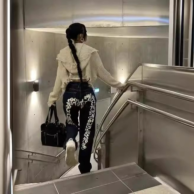 Jeans Letter Print Straight Wide Leg Pants Casual Loose Trousers