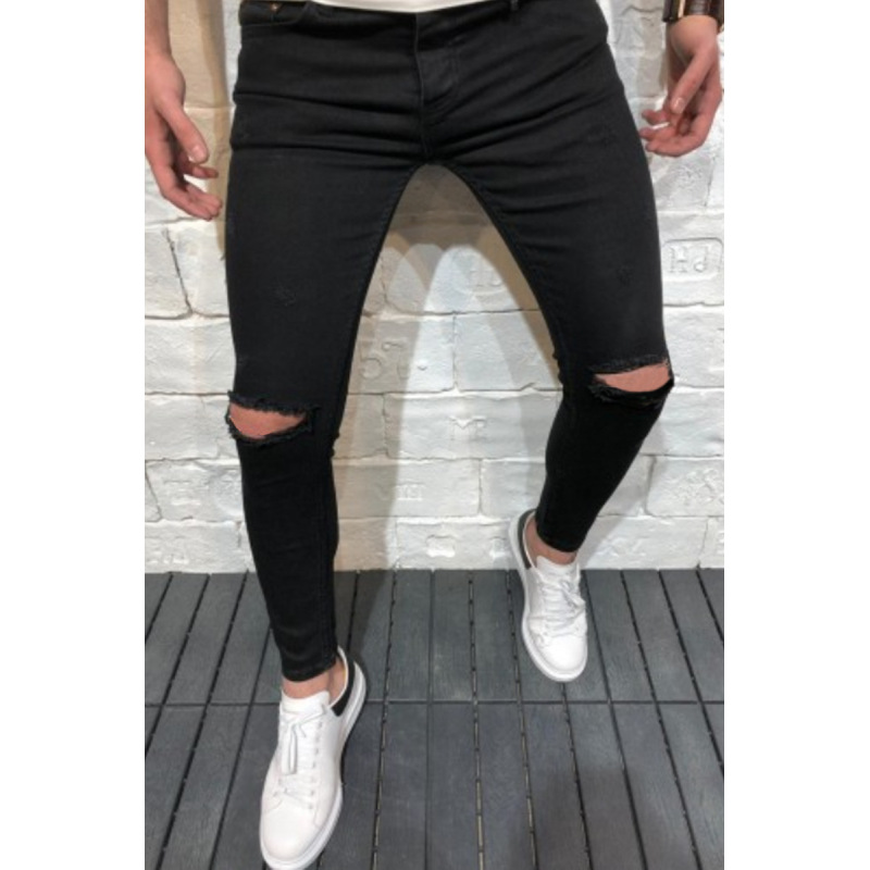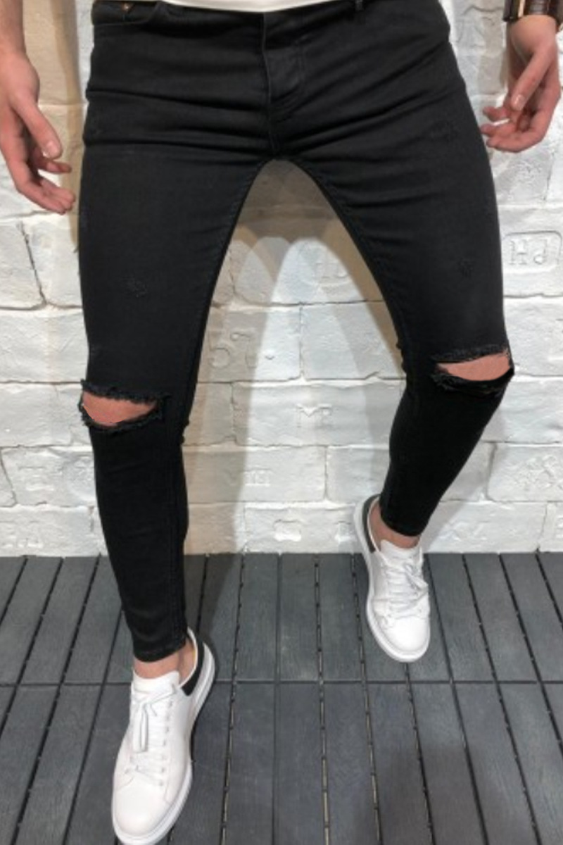 Jeans Straight Leg Denim Knee Holes Washed Men'S Jeans Trousers