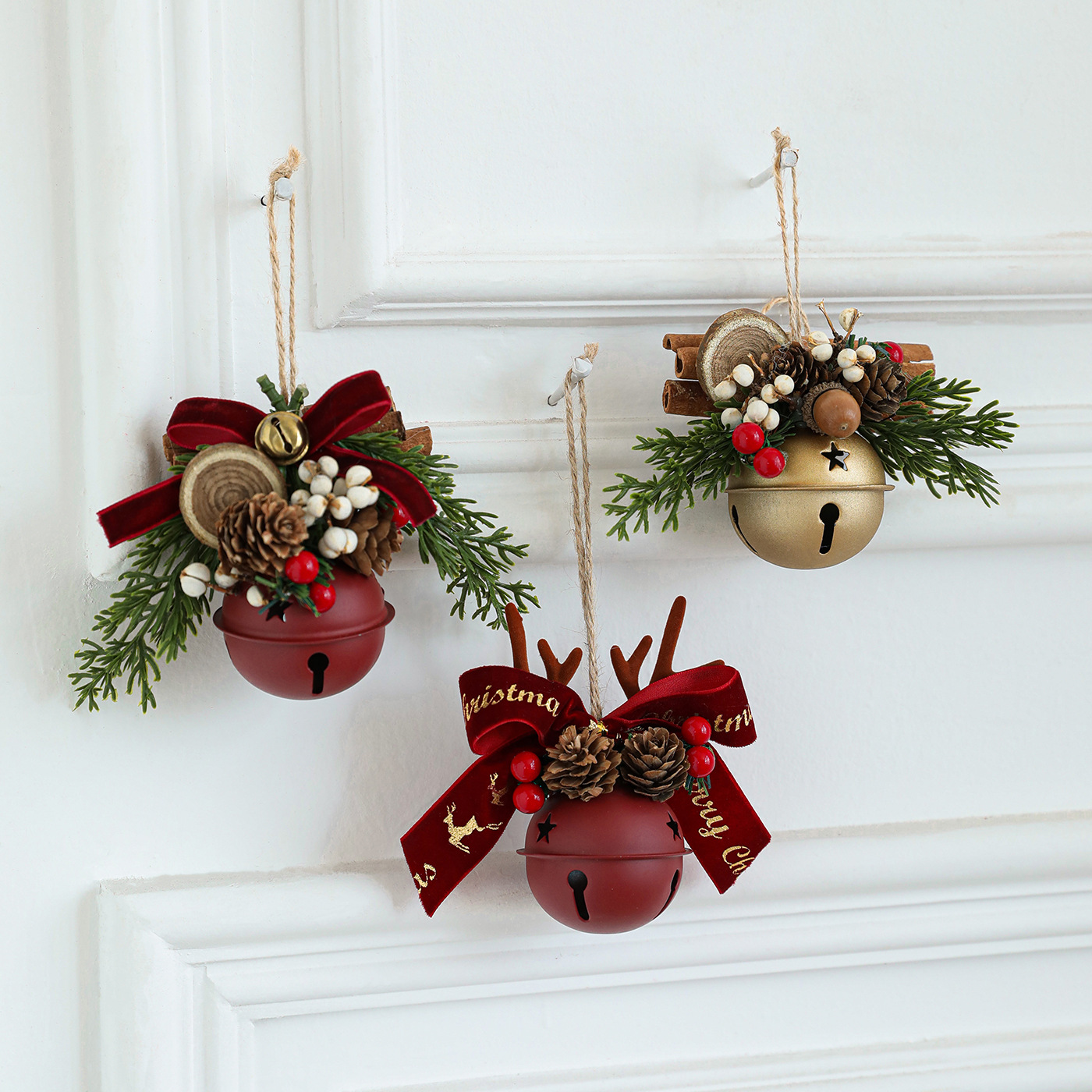 Color: golden bow antlers Bell, golden pine cone antlers Bell, red antlers Bell, white red bow antlers Bell, White green bow antlers Bell, red pine cone pine Bell, Golden cinnamon pine Bell, red cinnamon pine Bell, white cinnamon pine Bell, pine cone pendant, red pine Bell