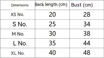 Size: XS back length 20cm (recommended 1-2 jin),S back length 25 (recommended 3-4 Jin),M back length 30 (recommended 5-7 jin),L size back length 35 (recommended 8-10 jin),XL back length 40 recommended 11-17 Jin