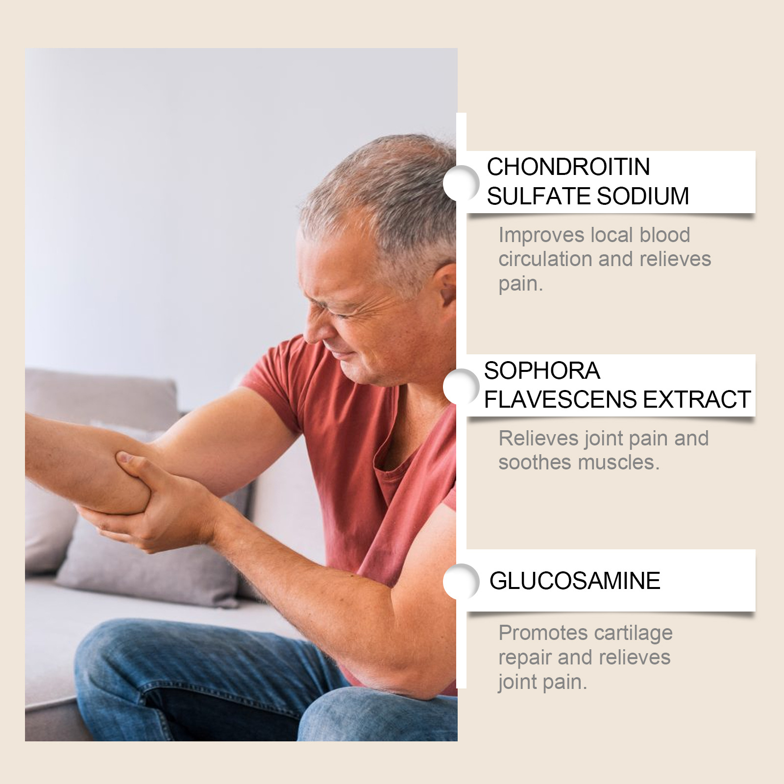 Ingredients: water, sodium chondroitin sulfate, kuh-Seng extraction, glucosamine, tocopherol (vitamin E)
