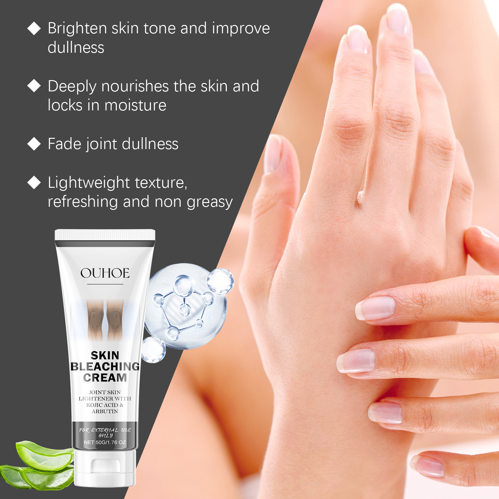 Ingredients: aloe leaf extract, nicotinamide, vitamin C, arbutin, kojic acid