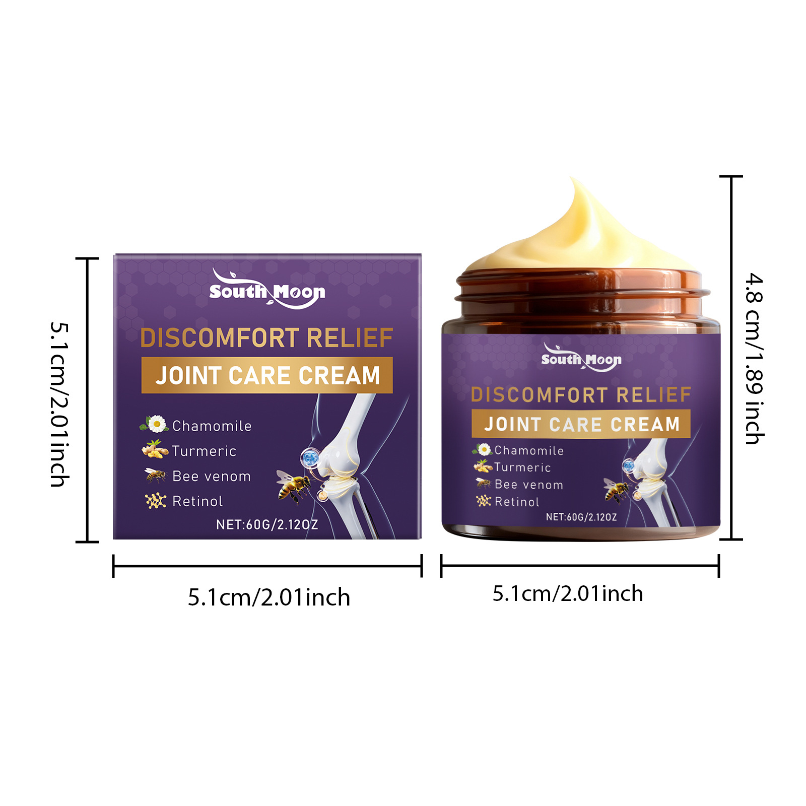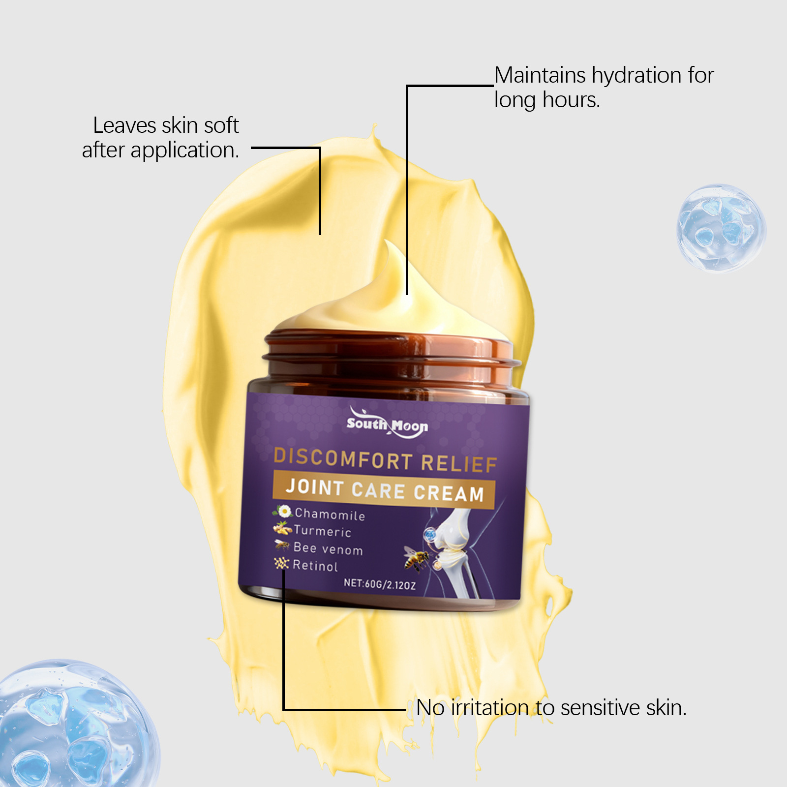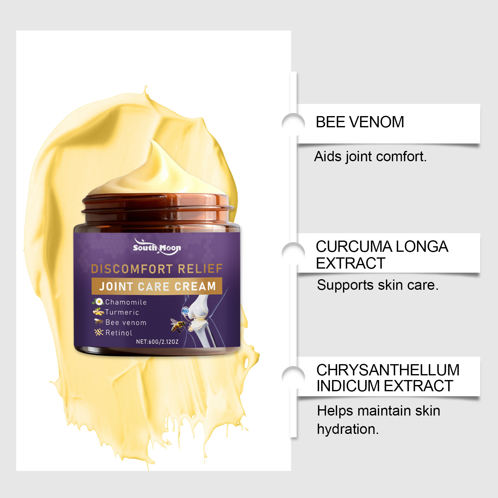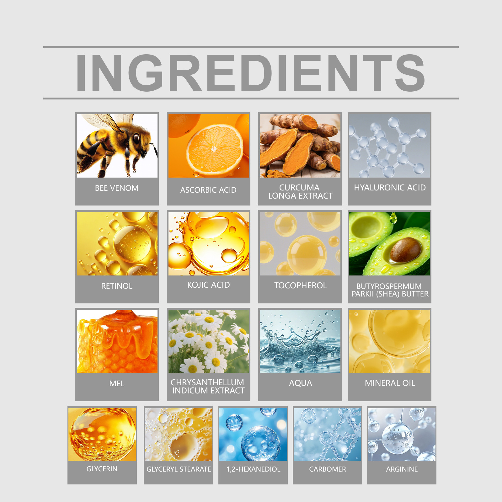 Active ingredients: bee venom, ascorbic acid (vitamin C), turmeric extract, hyaluronic acid, retinol, kojic acid, tocopherol (vitamin E), shea butter, honey and chamomile extract.