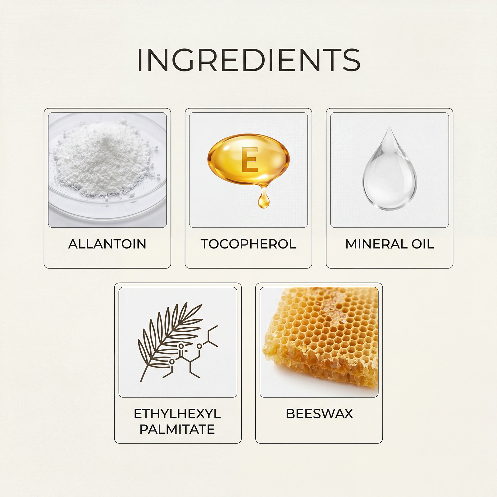 Active Ingredients: Allantoin, Tocopherol (Vitamin E)