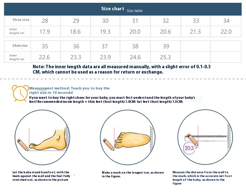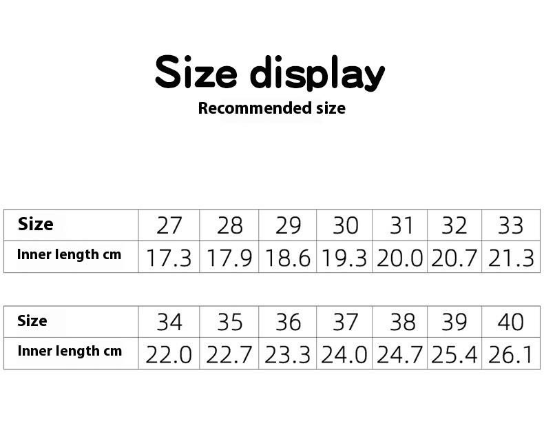 Size: size 28 insole foot cm, size 29 insole foot cm, size 30 insole foot cm, size 31 insole foot 20cm, size 32 insole foot cm, size 33 insole foot cm, size 34 insole cm, size 35 insole cm, size 36 insole cm, size 37 insole cm, size 38 insole cm, size 39 insole 25.3cm