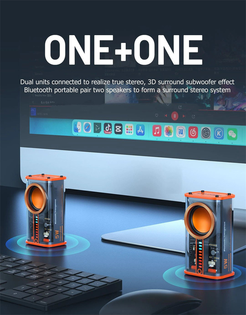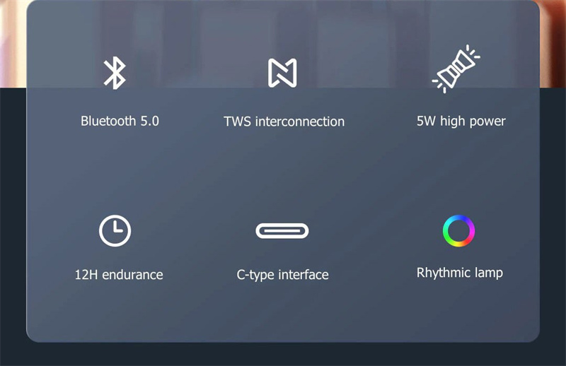 1. True Wireless Stereo - Support two speakers playing music synchronously through a Bluetooth connection, forming a wireless left and right channel system to deliver you true stereo sound.