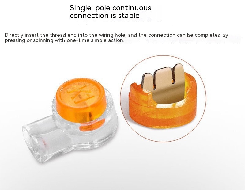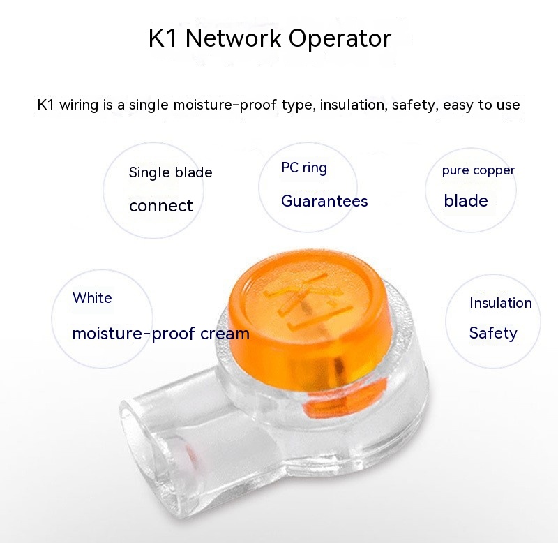 K1 connector is a single moisture-proof type, which is connected by a single knife and used for direct connection of the second line. Applicable wire diameter is 0.4-0.9mm, insulation outer diameter is 2.0mm. Connector is suitable for fast connection of medium and small power lines. It solves the problem of complicated operation of screw crimp-type terminal wiring. When wiring, the wire does not need to remove the insulation layer, directly insert the thread head into the wiring hole of connector, and the connection can be completed by pressing or spinning.