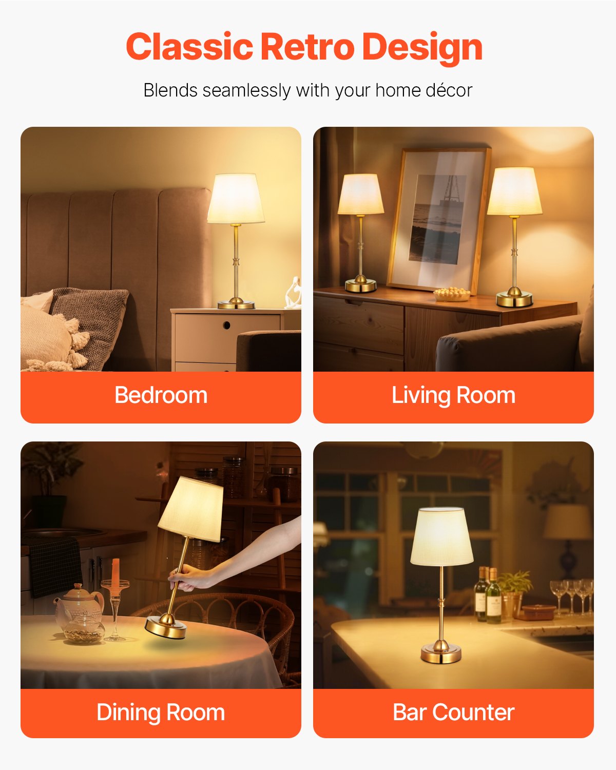 VEVOR kabellose Tischlampe Tischleuchte (2 Stk.) mit Stoffschirm & 5200 mAh eingebauter wiederaufladbarer Akku, Schreibtischlampe, dimmbar (3-stufig), Tischleuchte für Schlafzimmer Nachtisch Gold