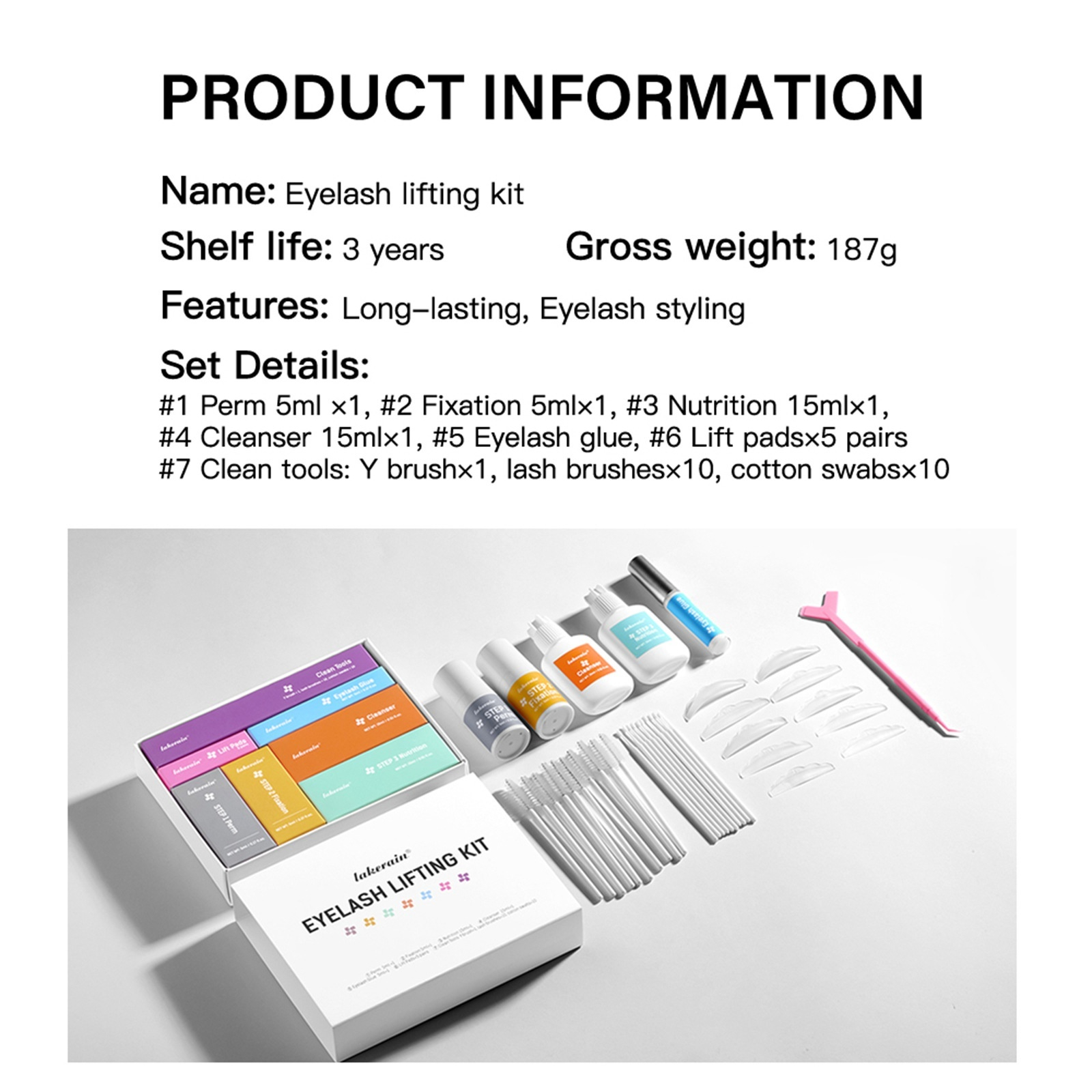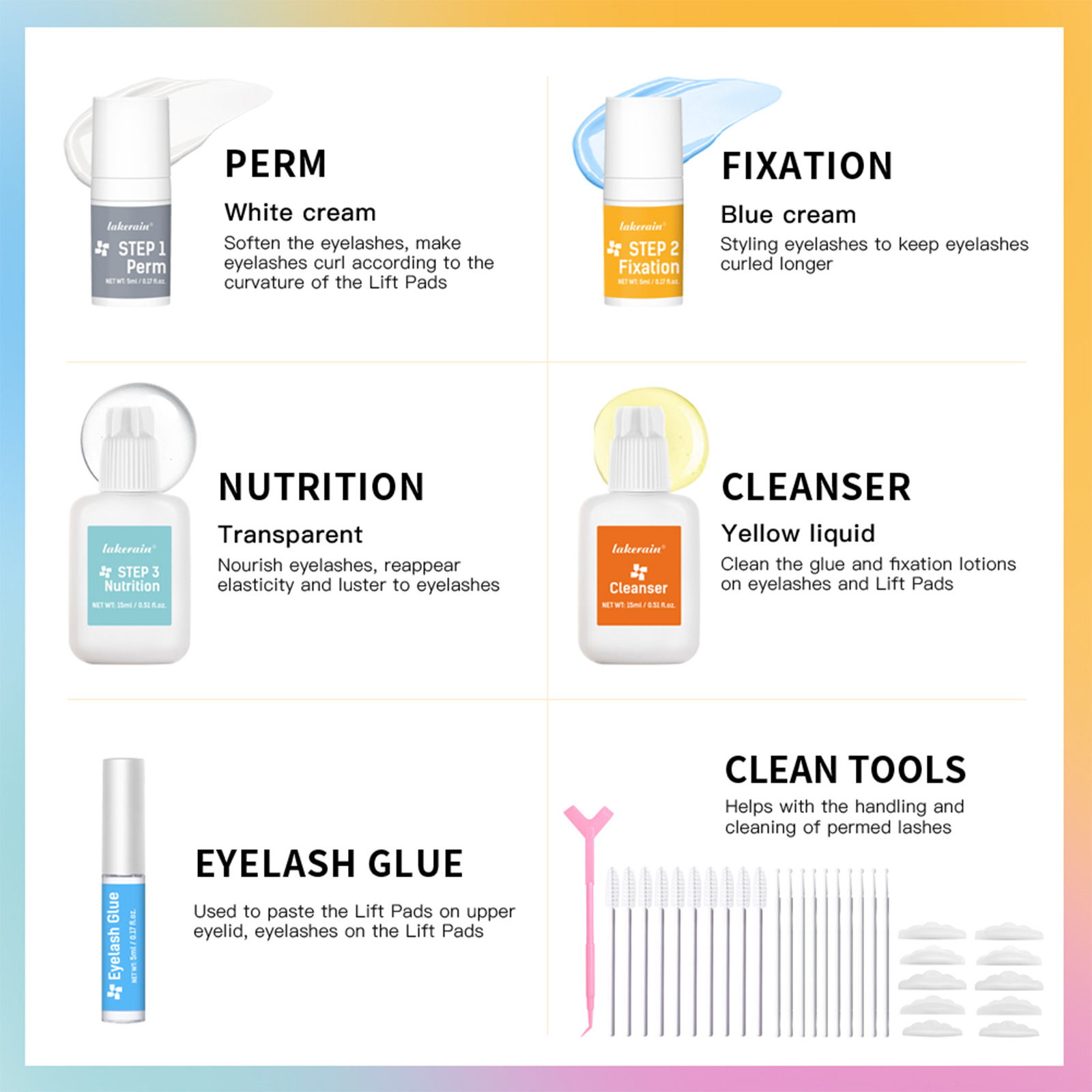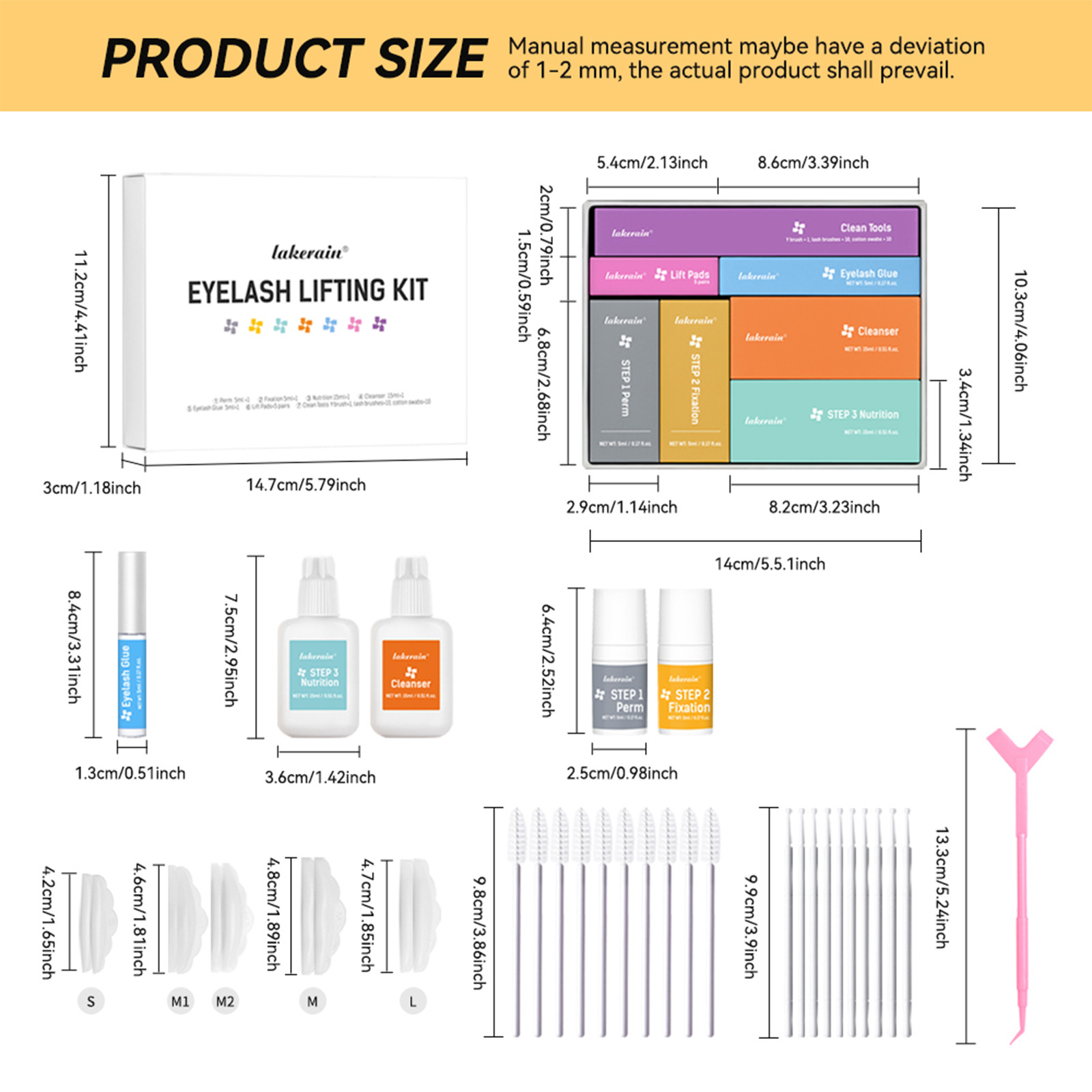 Perm x 1 pc + Fixation x 1 pc + Nutrition x 1 pc + Cleanser x 1 pc + Eyelash glue x 1 pc + Lift Pads x 5 palrs + Y brush x 1 pc + Lash brushes x 10 pc + Cotton Swabs x 10 pc
