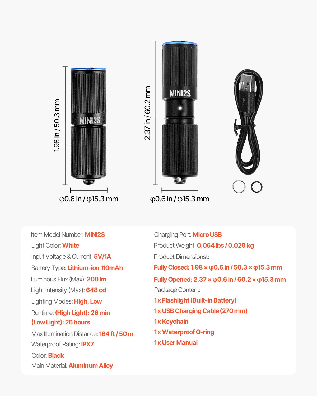 Keychain Flashlight Rechargeable Mini Flashlight 200 High Lumens IPX7 Waterproof