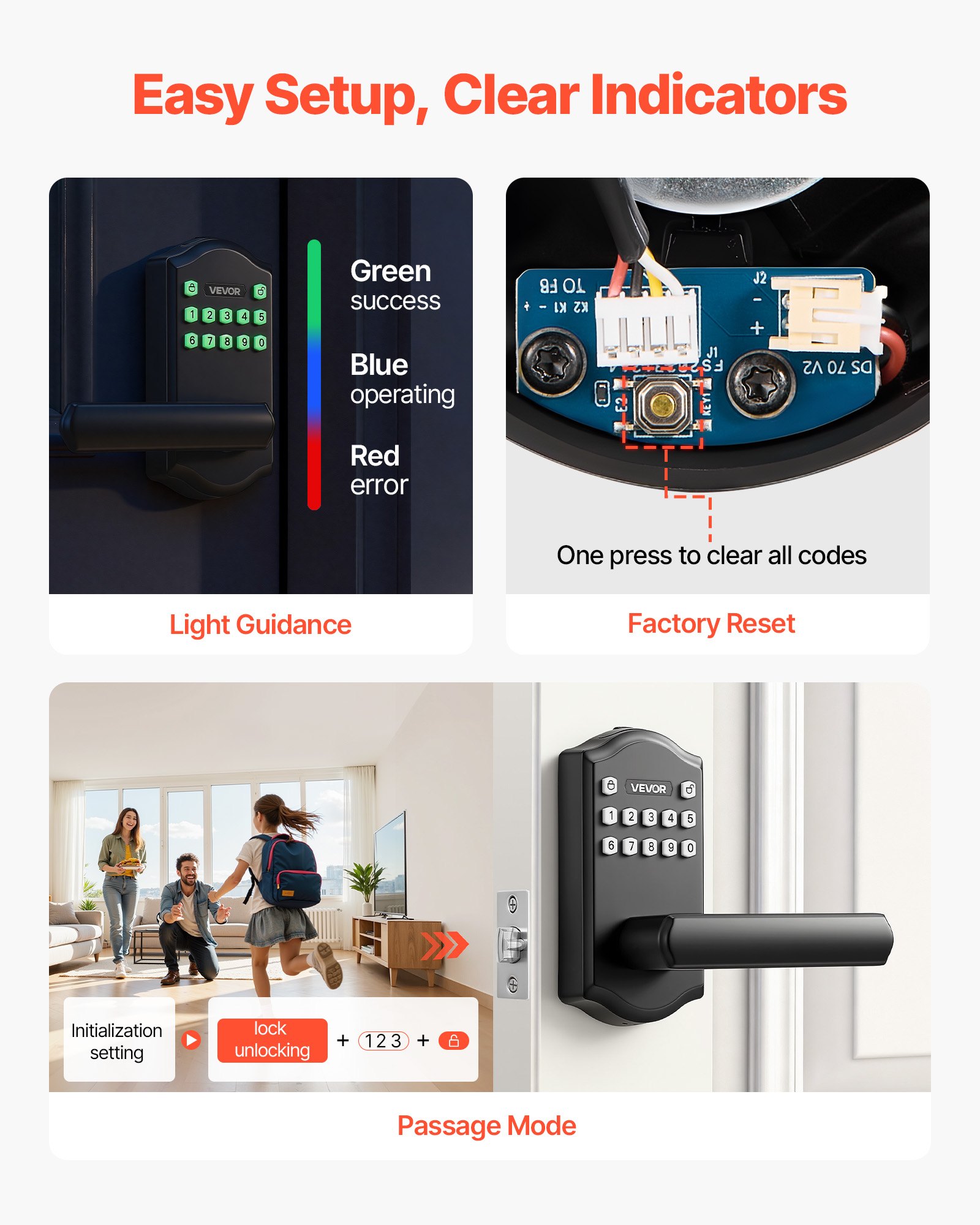 Smart Auto-Lock: Select from 5s, 10s, 20s, 30s, or 60s auto-lock intervals to fit your daily routine. This keypad door handle features an LED-backlit keypad, a low-battery reminder, an anti-peep mode, and a silent mode for quiet nights