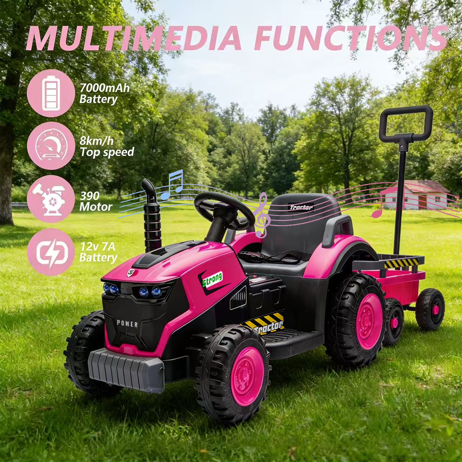 • [Entertaining Multimedia Features]: Like a real vehicle, this kid's ride on tractor with trailer features a multimedia center with music, displaying remaining battery power for convenient charging. It offers various functions such as music/radio/Bluetooth/USB/bright headlights/horn, allowing kids to enjoy the fun of lights and music while driving. Note: This is one of the few tractor on the market equipped with Bluetooth music and lighting.
