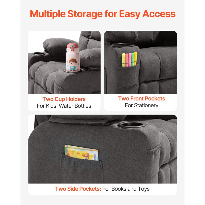 Convenient Storage Design: Built-in storage on this children's recliner chair includes cup holders to keep drinks in place, a large side pocket for books or toys, and a small front pocket for pens and stationery