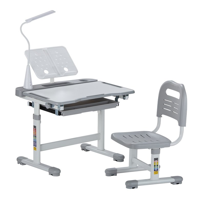 Kids Study Chair And Desk Set, Study Desk And Chair For Kids With Table Lamp, Adjustable Height & 0-40° Tilted Desktop Kids Desk And Chair, Children Study Table For Bedroom & Study Room, Grey