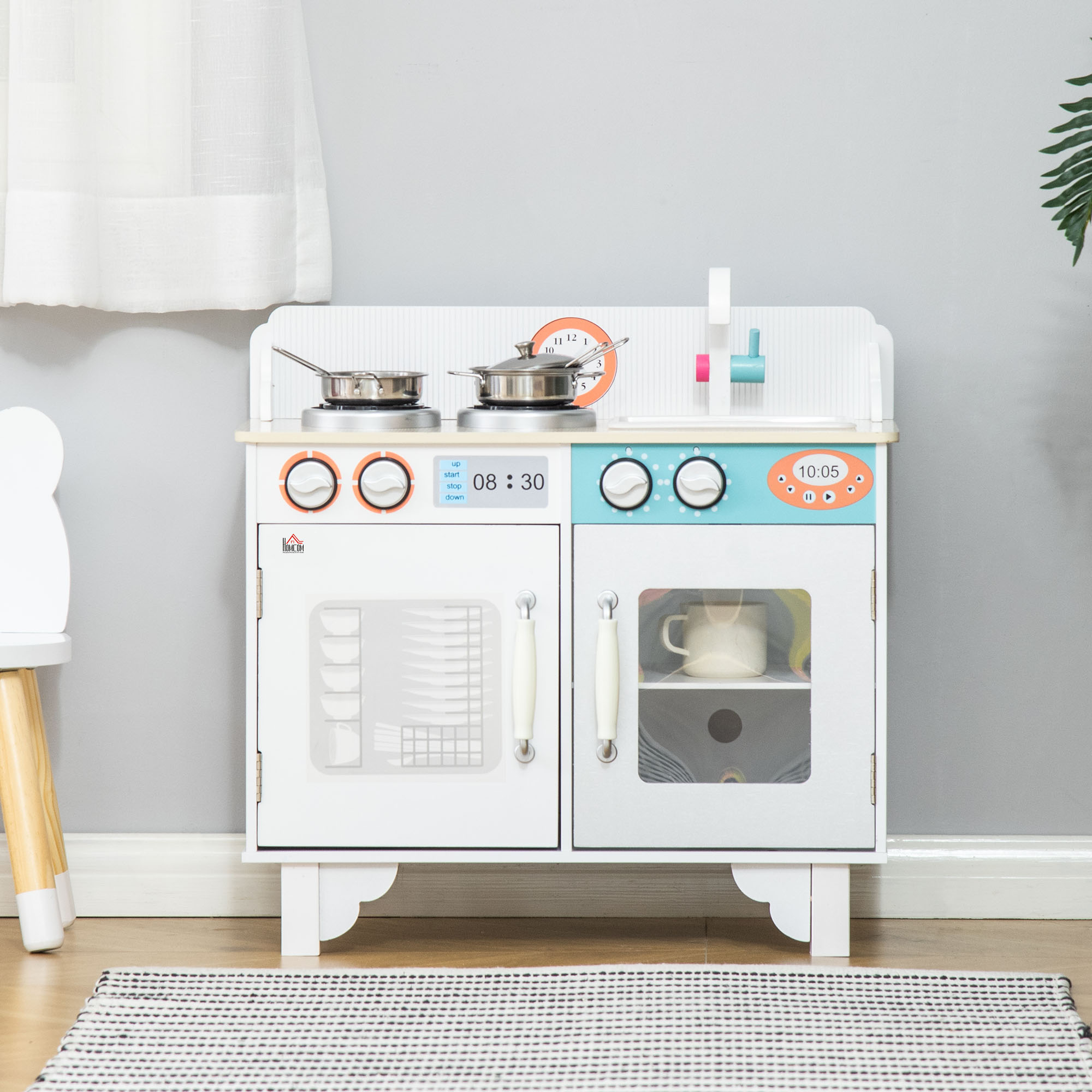 Playtime just got a lot better, thanks to this kids kitchen playset from . Their imagination can run wild as they use the sink, cooking bench, stainless pots and more. Turn the faucet and temperature dials to get their make-believe cooking underway. When playtime's over, store the accessories in the cabinets, keeping your room tidy. Don't worry about getting the set messy – made from MDF, it's easy to clean. The smooth rounded surfaces create a safe space for your child to play.
