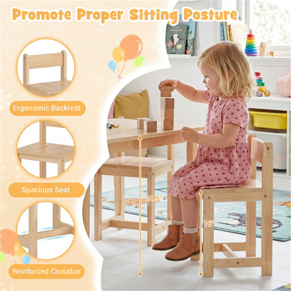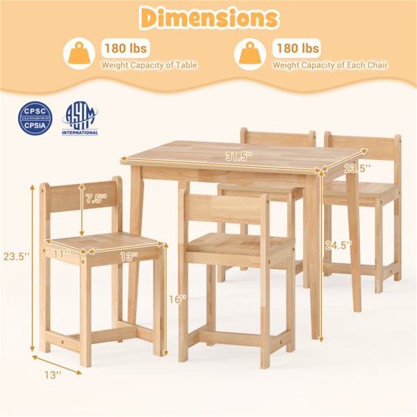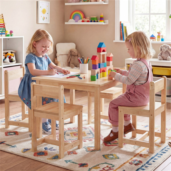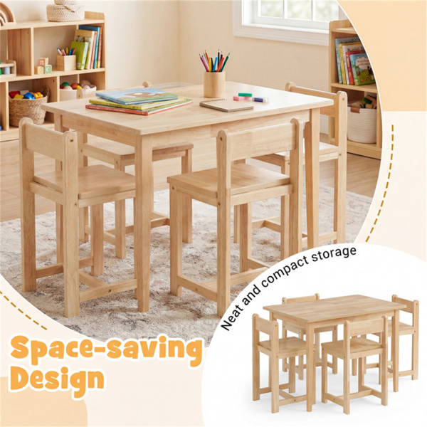 Kids Wooden Table And Chairs Set (1 Table + 4 Chairs), Rubber Wood Toddler Activity Set (Natural)