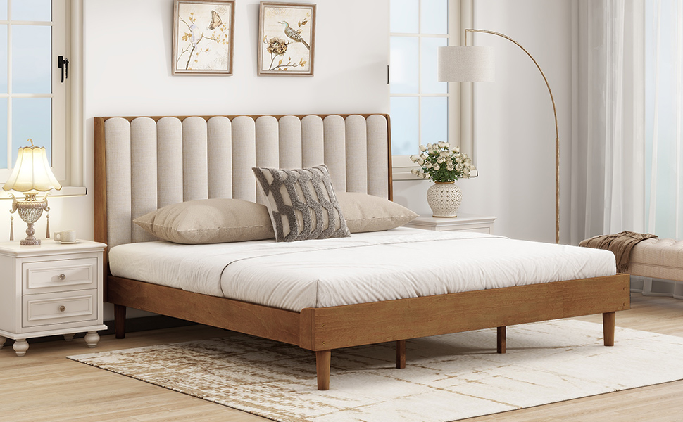 Product Name:King Size Wood Bed with Piano Key Style Upholstered Headboard , Wood Bed with Strengthened Bed Frame ,Wheat(Old Sku W504S00258)