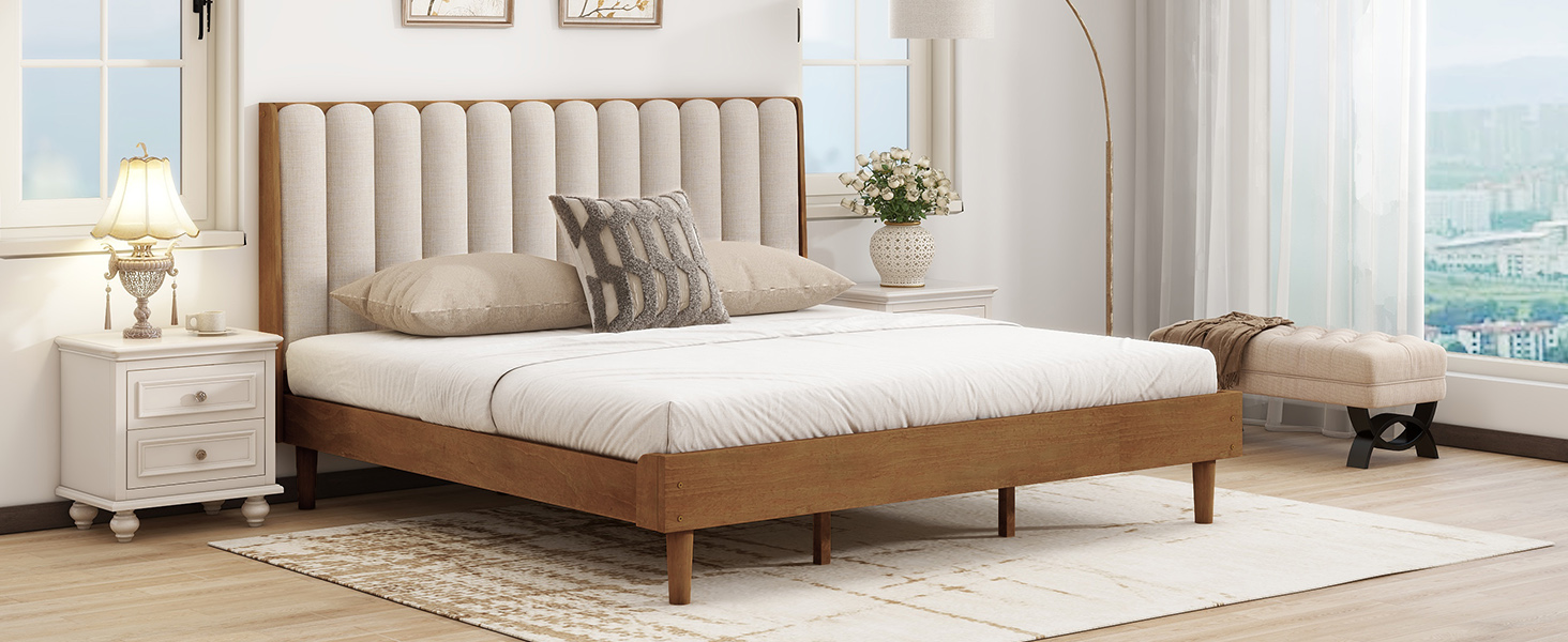 King Size Wood Bed With Piano Key Style Upholstered Headboard , Wood Bed With Strengthened Bed Frame ,Wheat