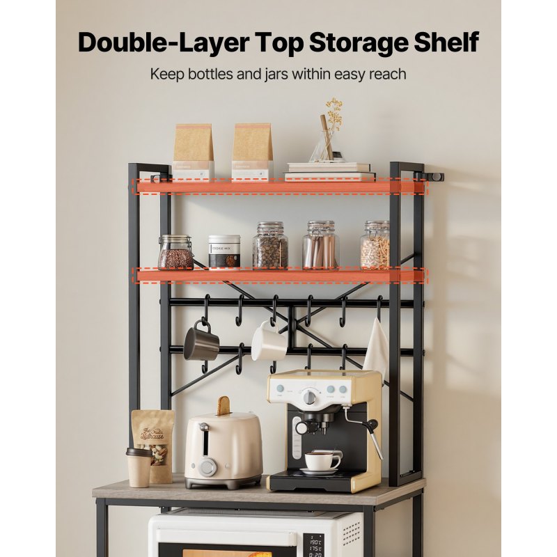Thoughtful Design: With 12 metal hooks for kitchen accessories, four adjustable feet for floor variation, and included installation hardware and an anti-tip device, our standing baker's rack focuses on daily usability. Dual wire shelves and a natural wood-grain top support both kitchen storage and broader household organization