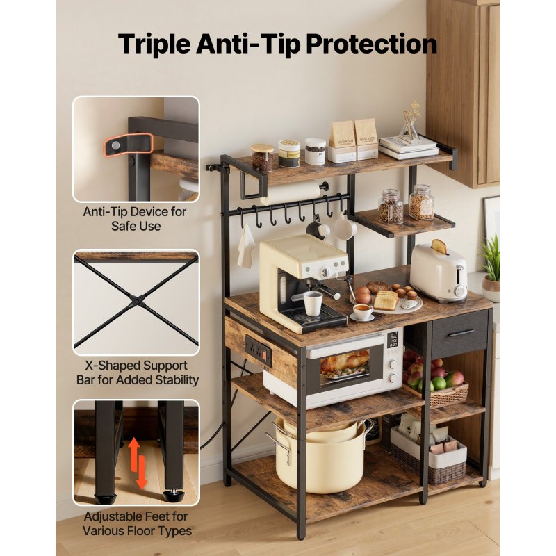 Triple Stability Design: This coffee bar station is equipped with a three-point stability design, including a top anti-tip wall anchor, reinforced X-style iron back wiring, and six adjustable support feet. The structure helps keep the entire unit level and stable during everyday kitchen use