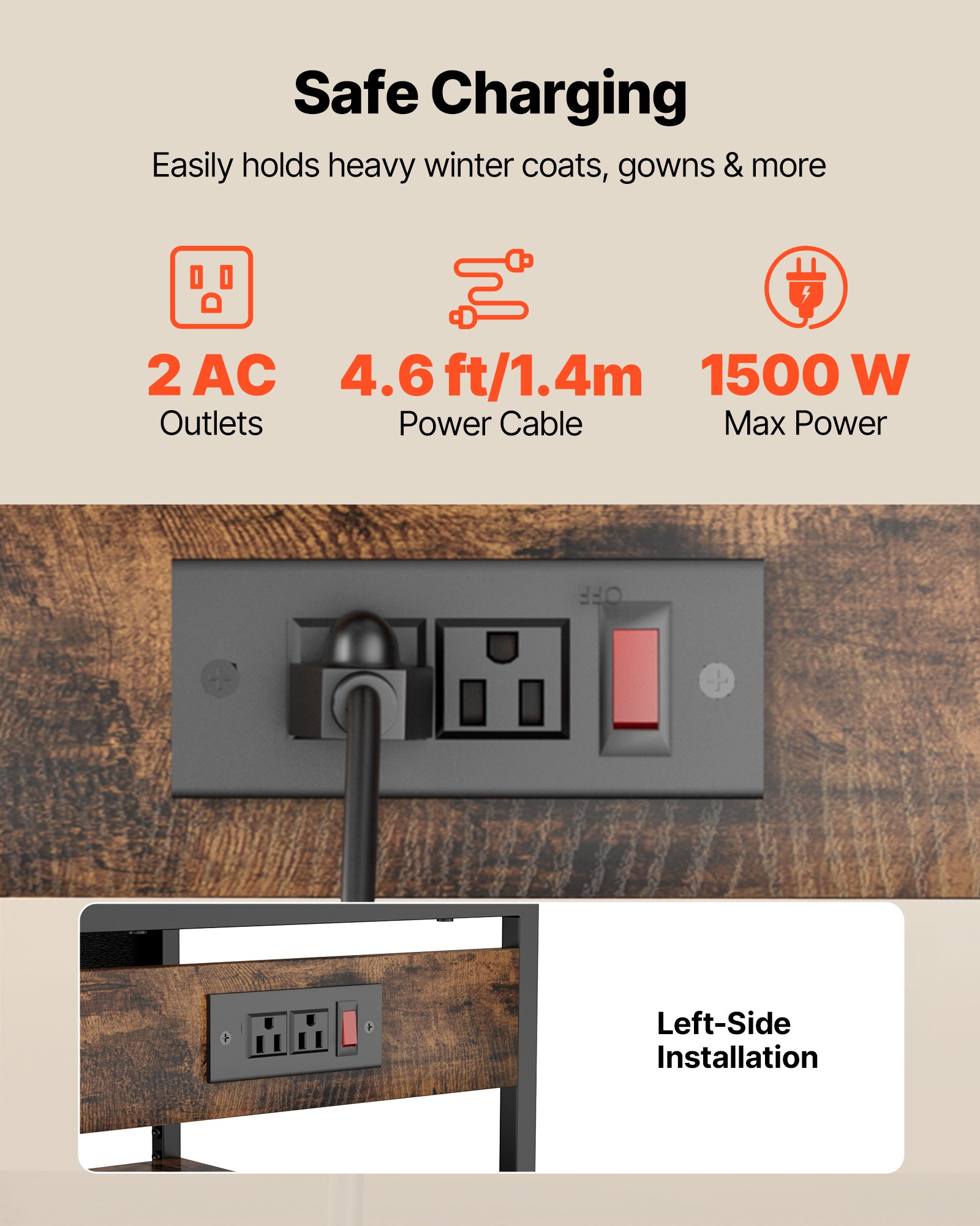 Built-In Power Control: This corner microwave stand integrates an ETL-certified US power system with two AC outlets and an indicator control switch rated at 125V/12A/1500W. A 4.6ft/1.4 m power cord with 16AWG wiring supports coffee makers, blenders, or small ovens while keeping countertops neat and organized