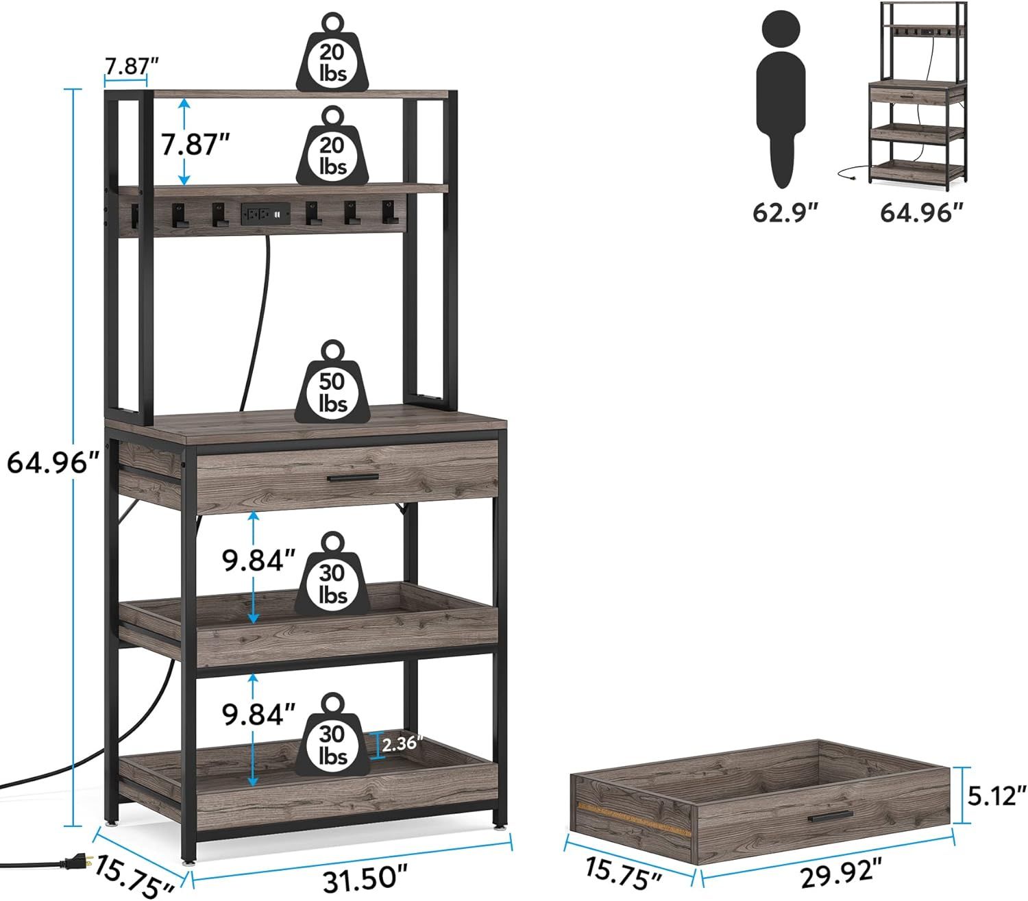 Large Storage Space: The overall size of this shelf is 31.5" L*15.8" W*65" H, which has 2 top shelves and 2 bottoms for your daily open storage needs. And the large sized drawer is perfect for more delicate utensils such as plates, spoons, and forks. Pull-out design shelves are ideal for daily usage. Six hooks can be easily used to hang your pans, spatulas, insulated gloves, whisks, etc.