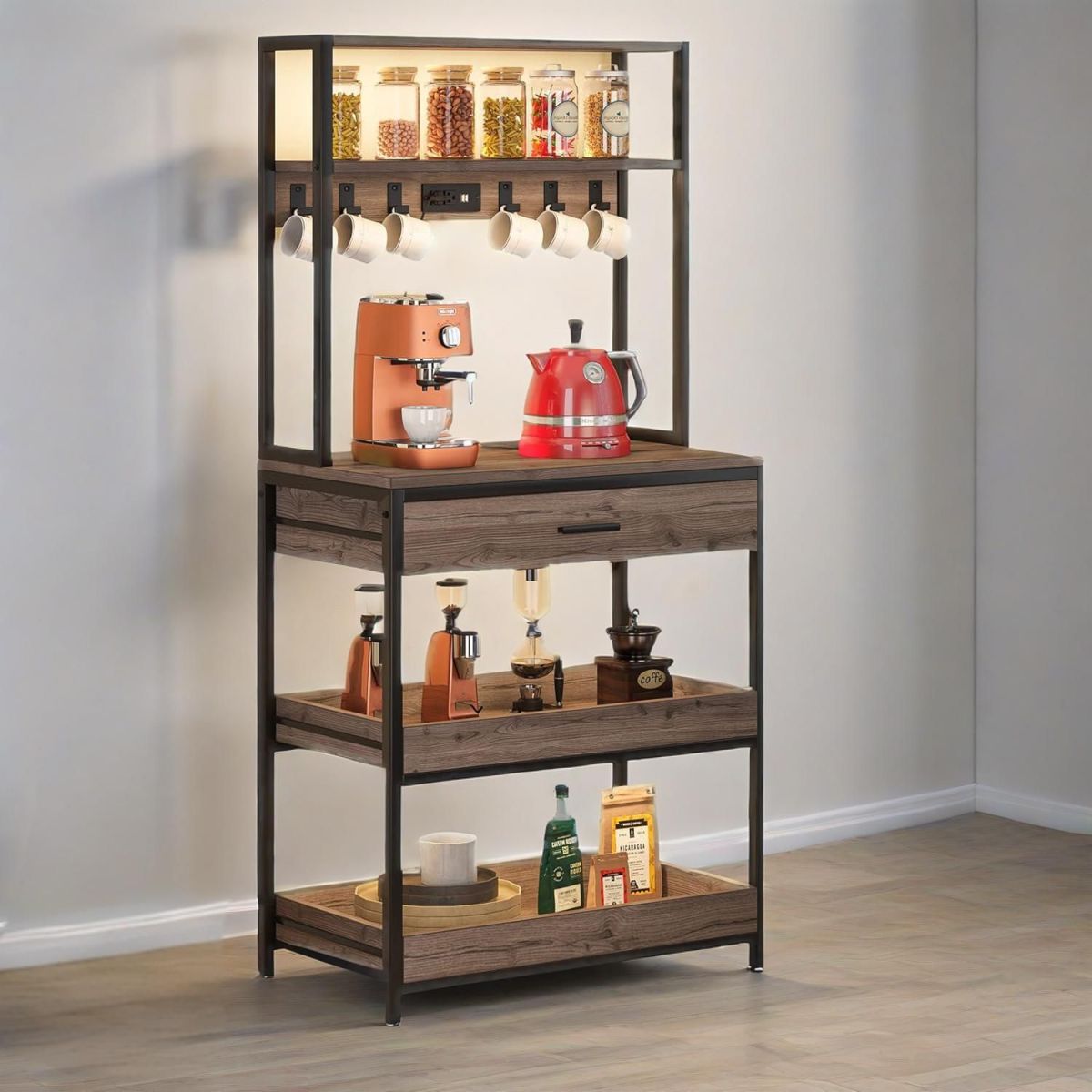 Kitchen Bakers Rack with Power Outlets: This kitchen storage rack is equipped with 2 standard plug outlets and 2 USB outlets. It’s convenient to charge microwave oven, coffee maker or toaster in your kitchen. Say goodbye to tangled wires, you can have your kitchen space neater and orderly.