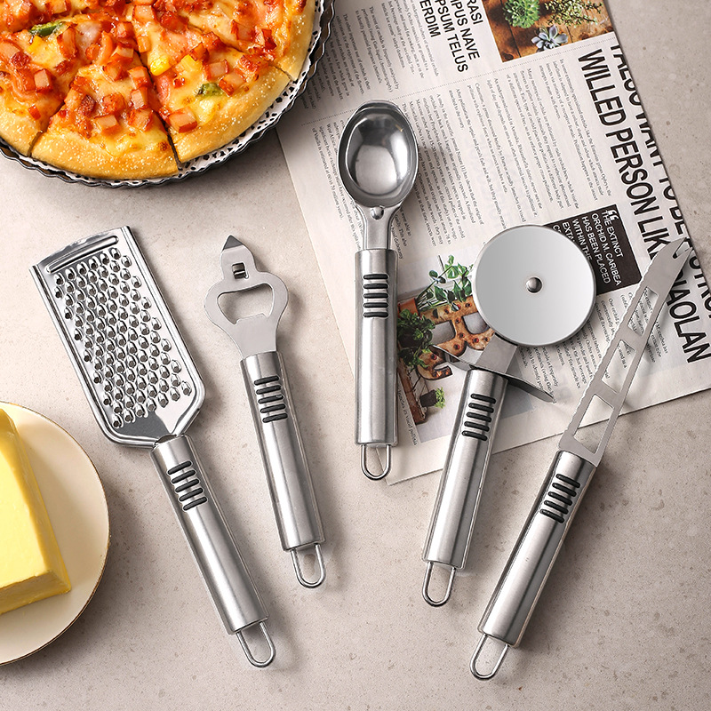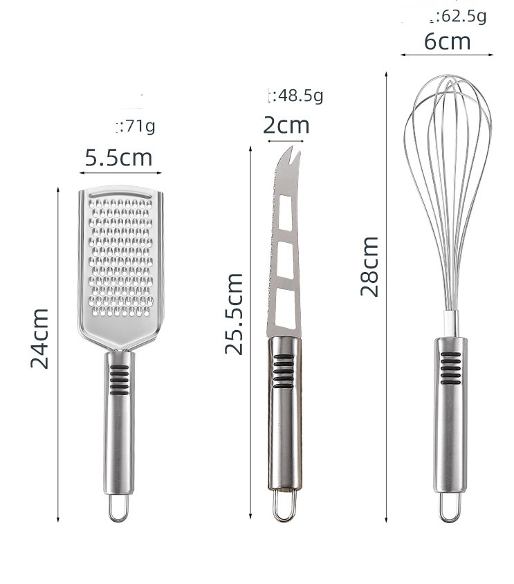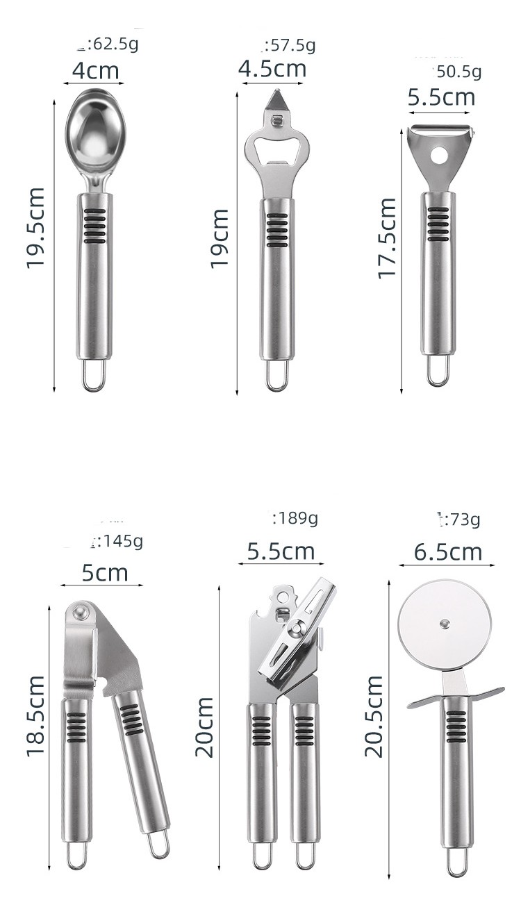 Specification: stainless steel striped can opener, stainless steel striped garlic press, stainless steel striped pizza knife, stainless steel striped ice cream spoon, stainless steel striped peeler, stainless steel striped eggbeater, stainless steel striped cheese knife, stainless steel striped bottle opener, stainless steel striped grater, stainless steel striped kitchenware 9-piece opp bag, stainless steel striped kitchenware 9-piece color box.