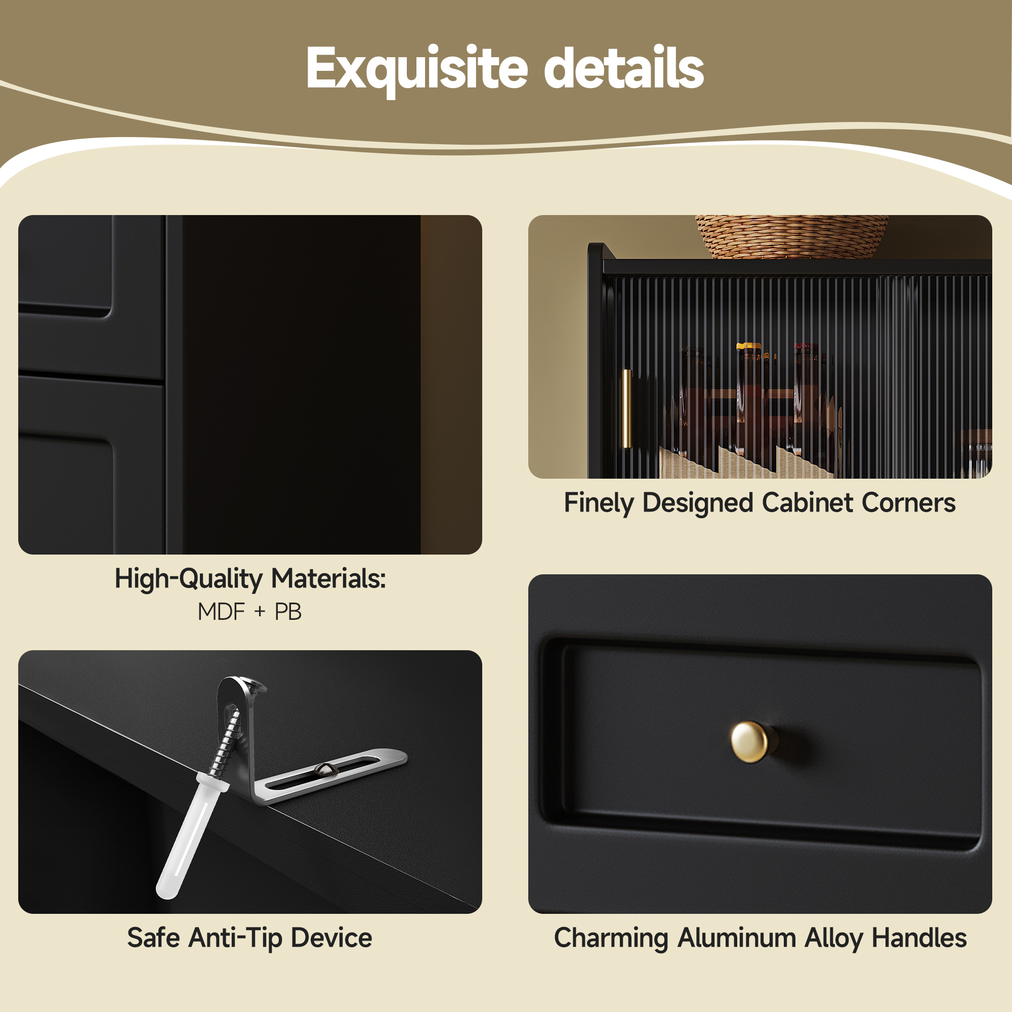 • Exquisite Design and High-Quality Materials: Crafted from premium MDF and PB boards with elegant glass sliding doors and aluminum handles, the meticulously detailed design seamlessly integrates into modern living environments.