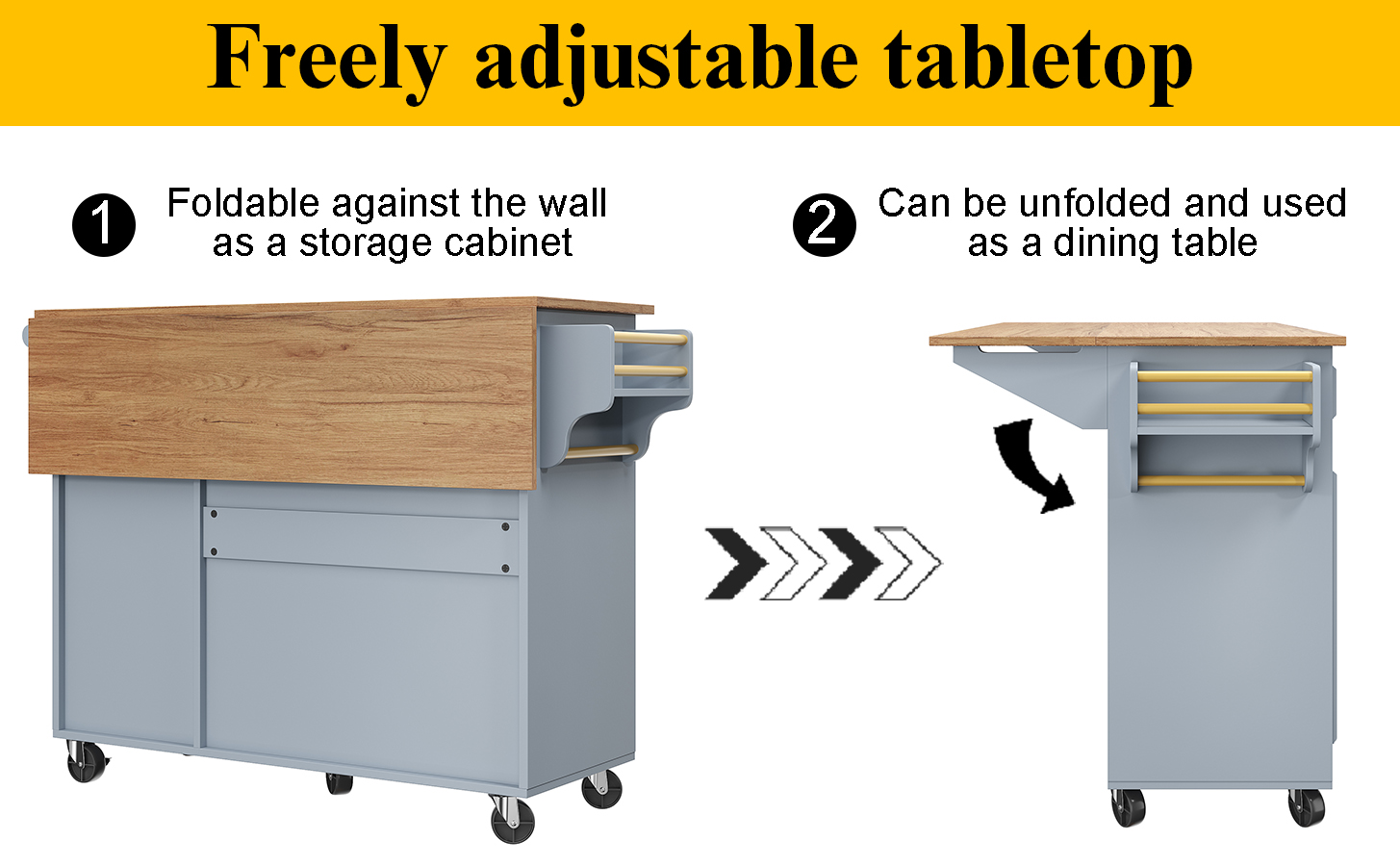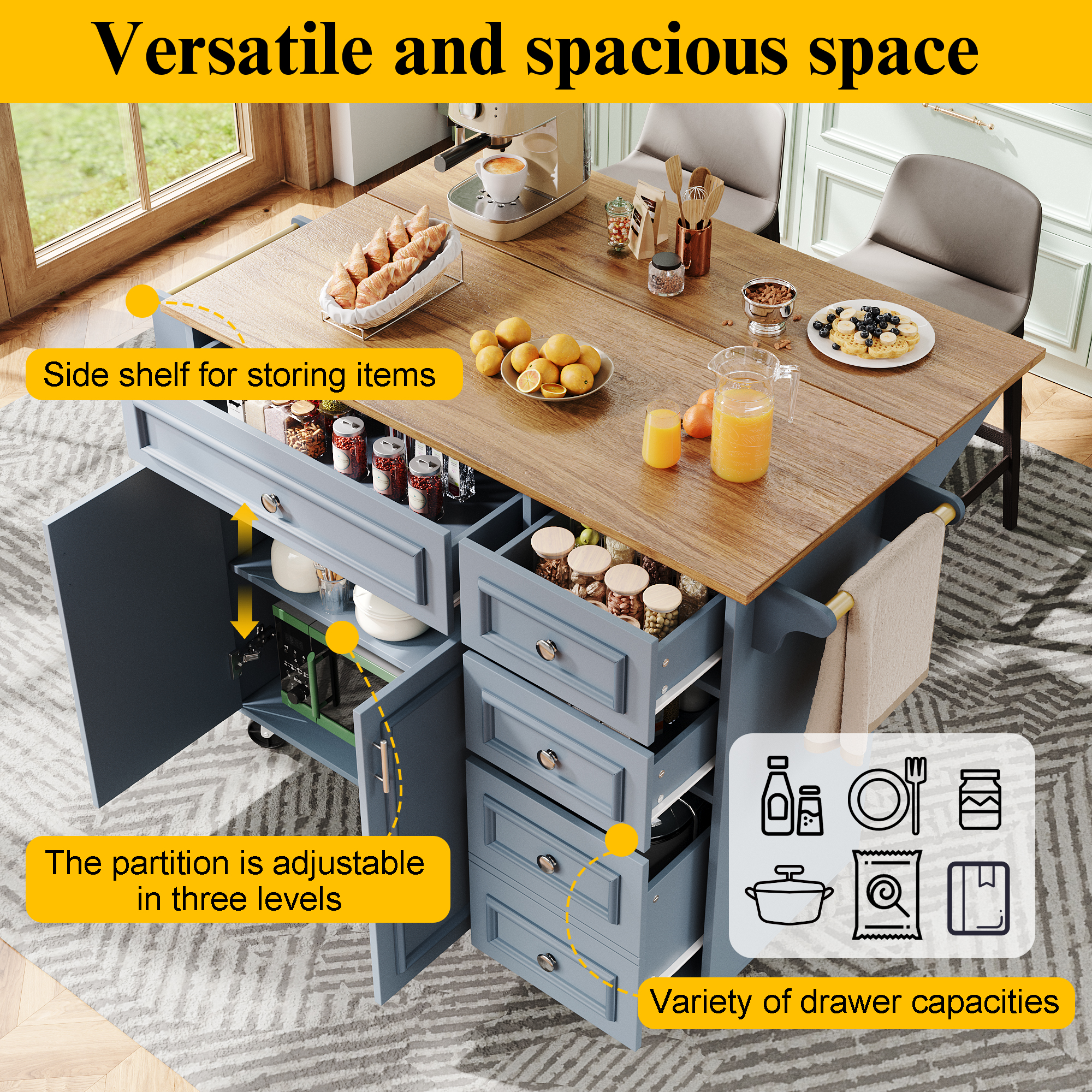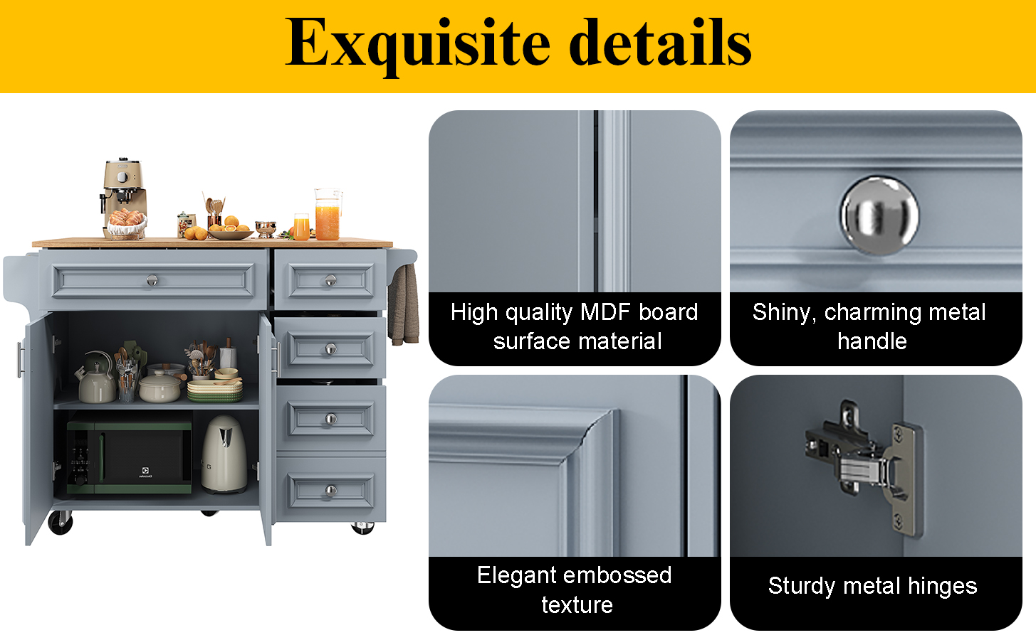 Product Name:Kitchen island (110×45-75×92cm), removable serving trolley buffet cabinet, dining trolley with vintage pattern, buffet cabinet, multifunctional dining table with storage space, Blue