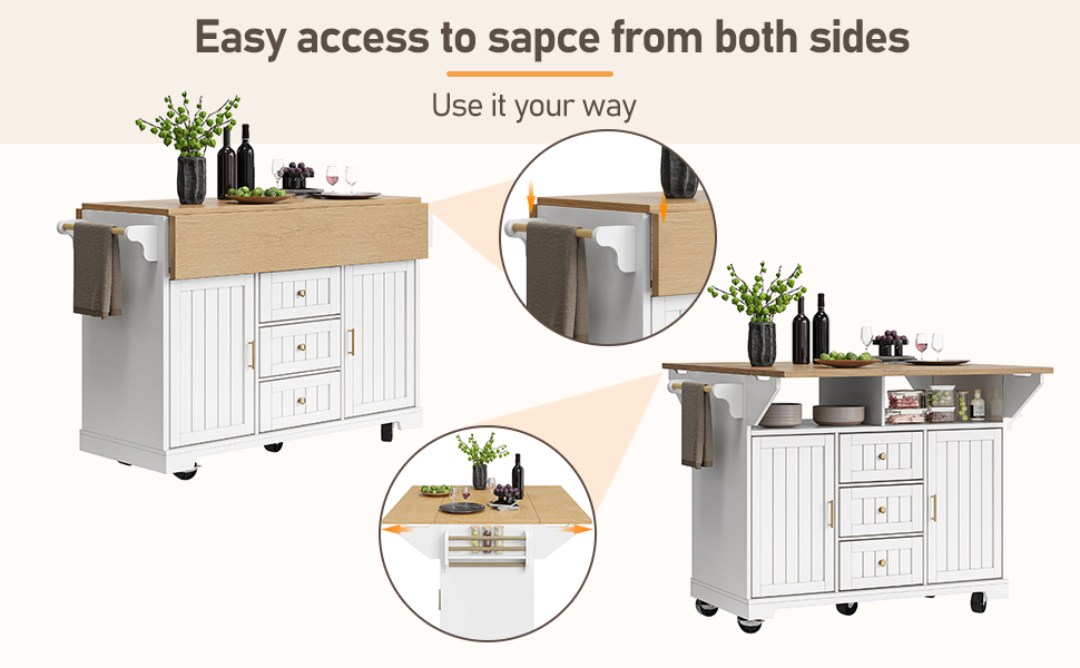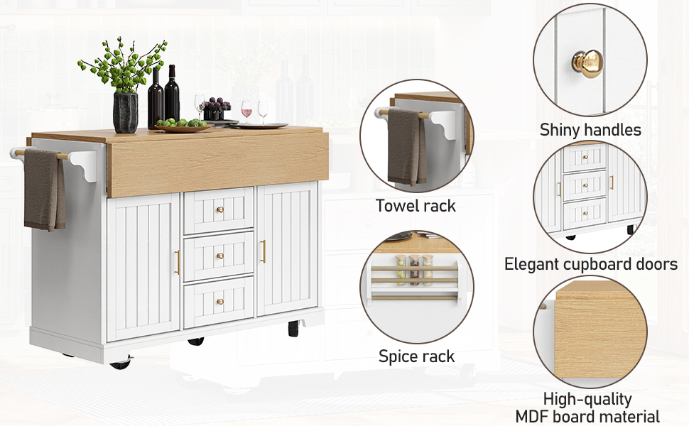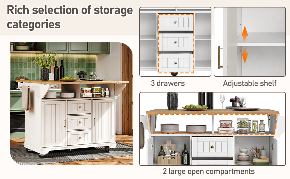 With three spacious drawers for plenty of storage, two independent compartments with double doors for different storage needs, adjustable shelves, towel rails, and over-the-door shelves for added convenience and efficiency in your kitchen.