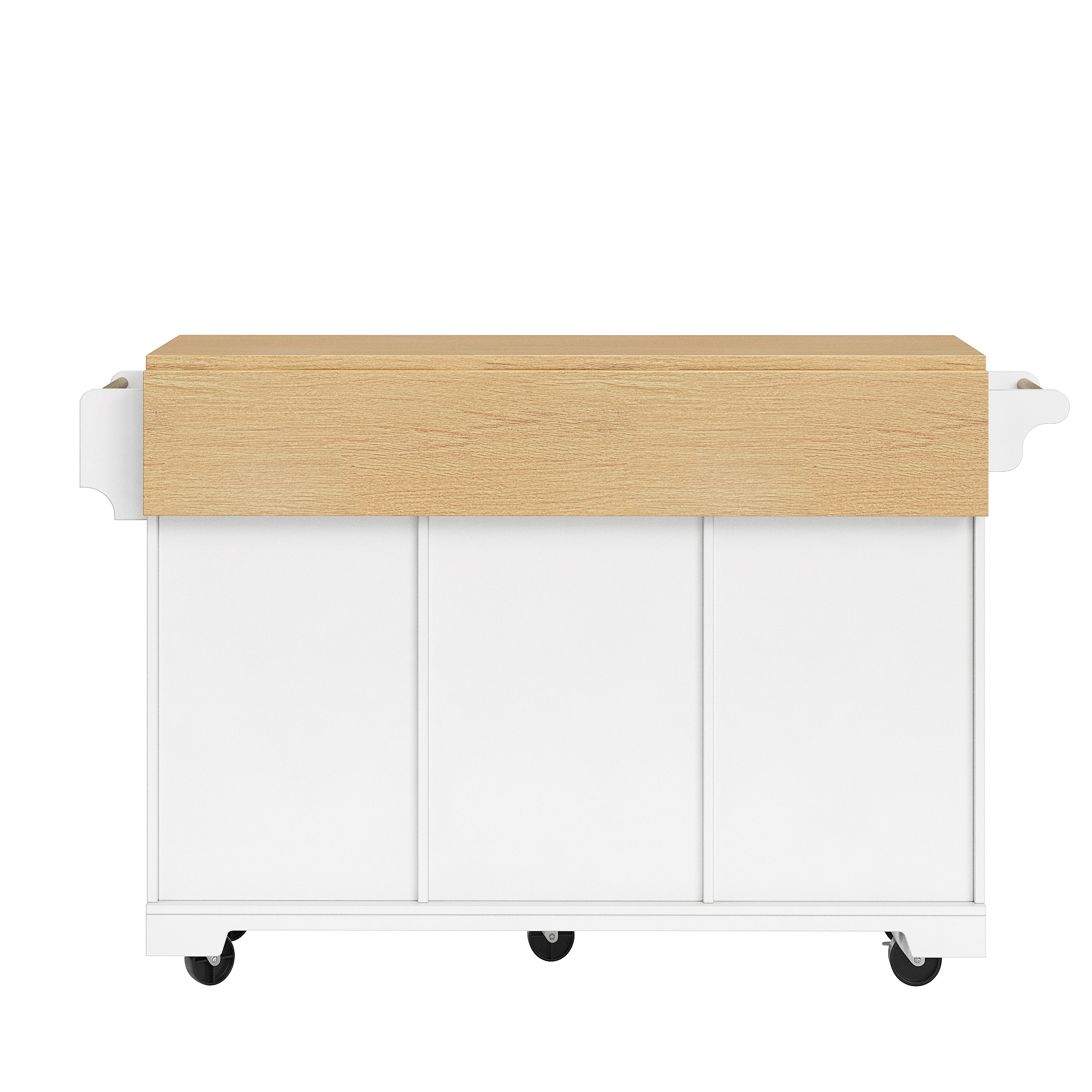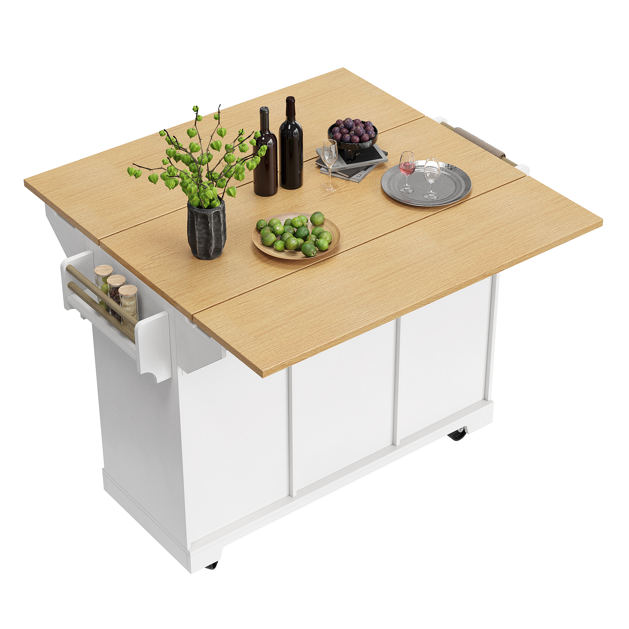 Product Name:Kitchen island, cabinet, sideboard 120 x 40 (80) x 95 cm, extendable kitchen trolley with casters, extendable on both sides, with towel rail and spice rack, two doors, three drawers, black/white