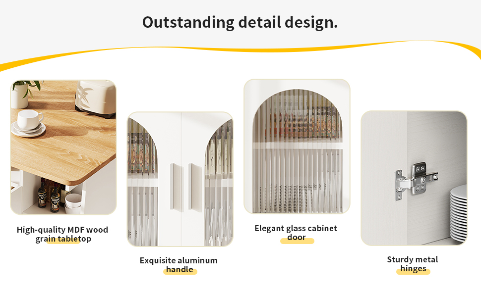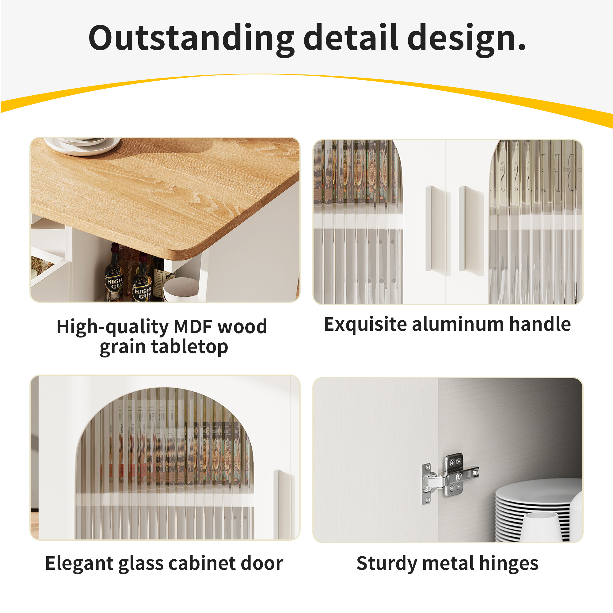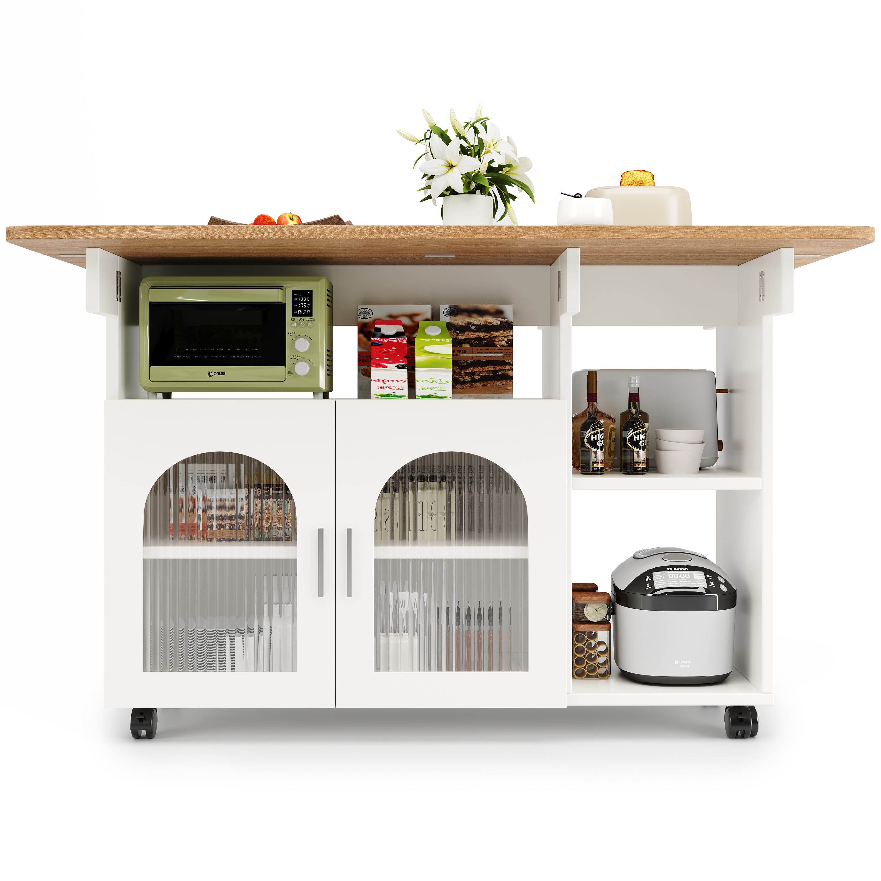 In addition to its striking design, this dining cart is also highly practical. The spacious worktop can be used as a temporary workbench or dining table, while the storage space underneath can accommodate a variety of kitchen utensils and appliances such as a coffee maker, toaster, and more, keeping your kitchen tidier and more organized. Furthermore, the open shelves and glass-fronted cabinets beneath the dining cart offer flexible storage options, allowing you to sort and arrange items according to your needs, significantly improving space utilization.