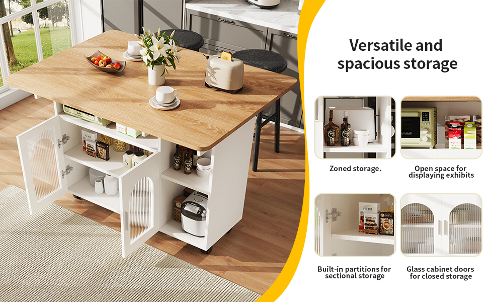 This island table is made of high-quality MDF and features sturdy metal hinges for the cabinet doors to ensure its durability and stability. Whether used daily or under heavy loads, it retains its solid structure and attractive finish.