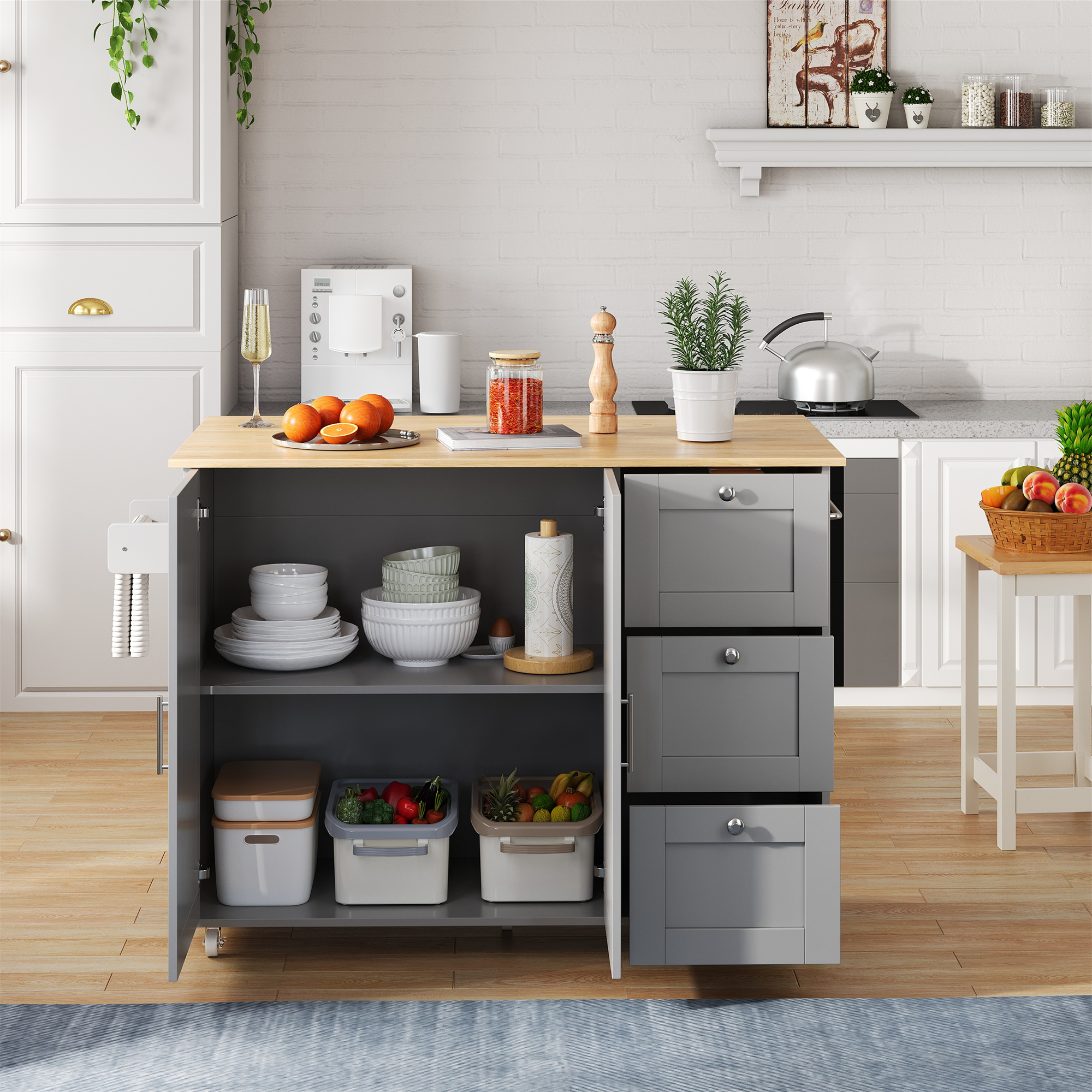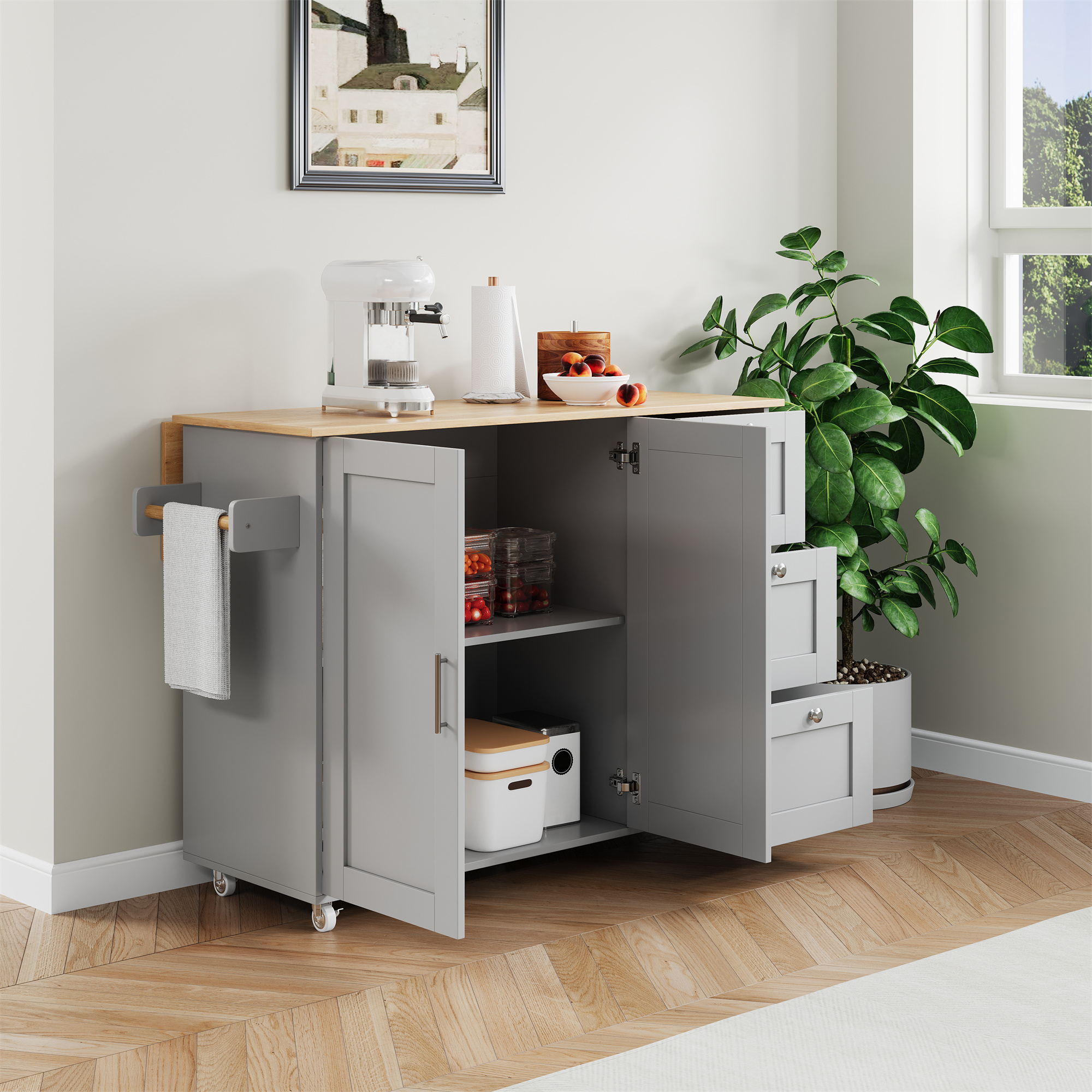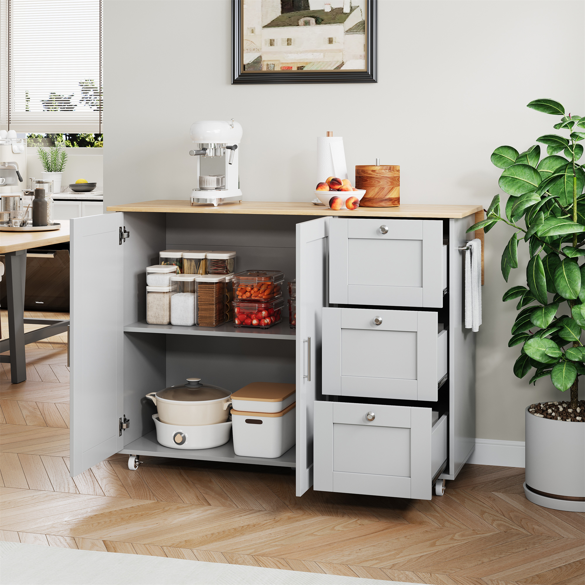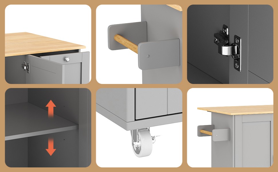 • Convenient towel rack and practical rolling design: A solid-wood towel rack on the side allows easy hanging of towels or dishcloths; equipped with five premium wheels (two with brakes) for flexible movement and secure positioning—meeting your needs anytime and anywhere.