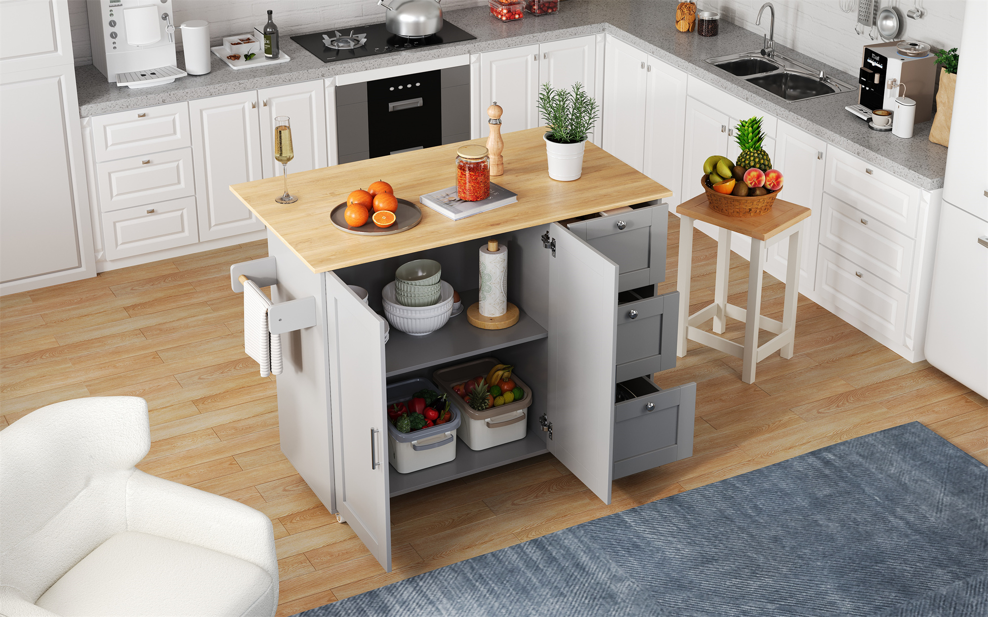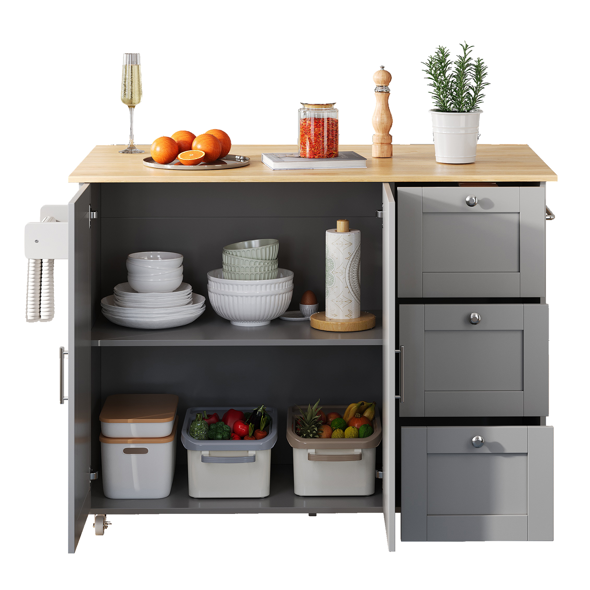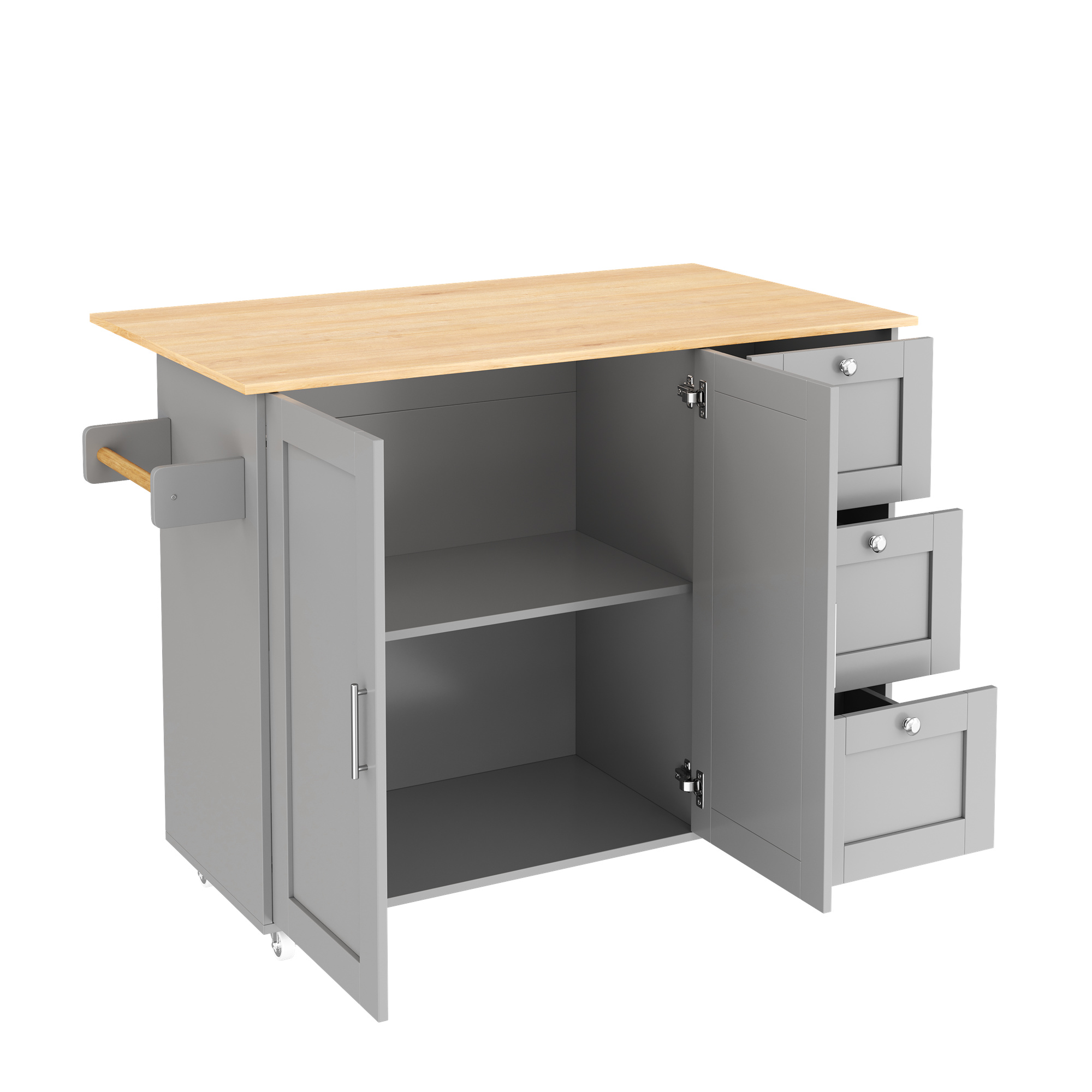 • Convenient towel rack and practical rolling design: A solid-wood towel rack on the side allows easy hanging of towels or dishcloths; equipped with five premium wheels (two with brakes) for flexible movement and secure positioning—meeting your needs anytime and anywhere.