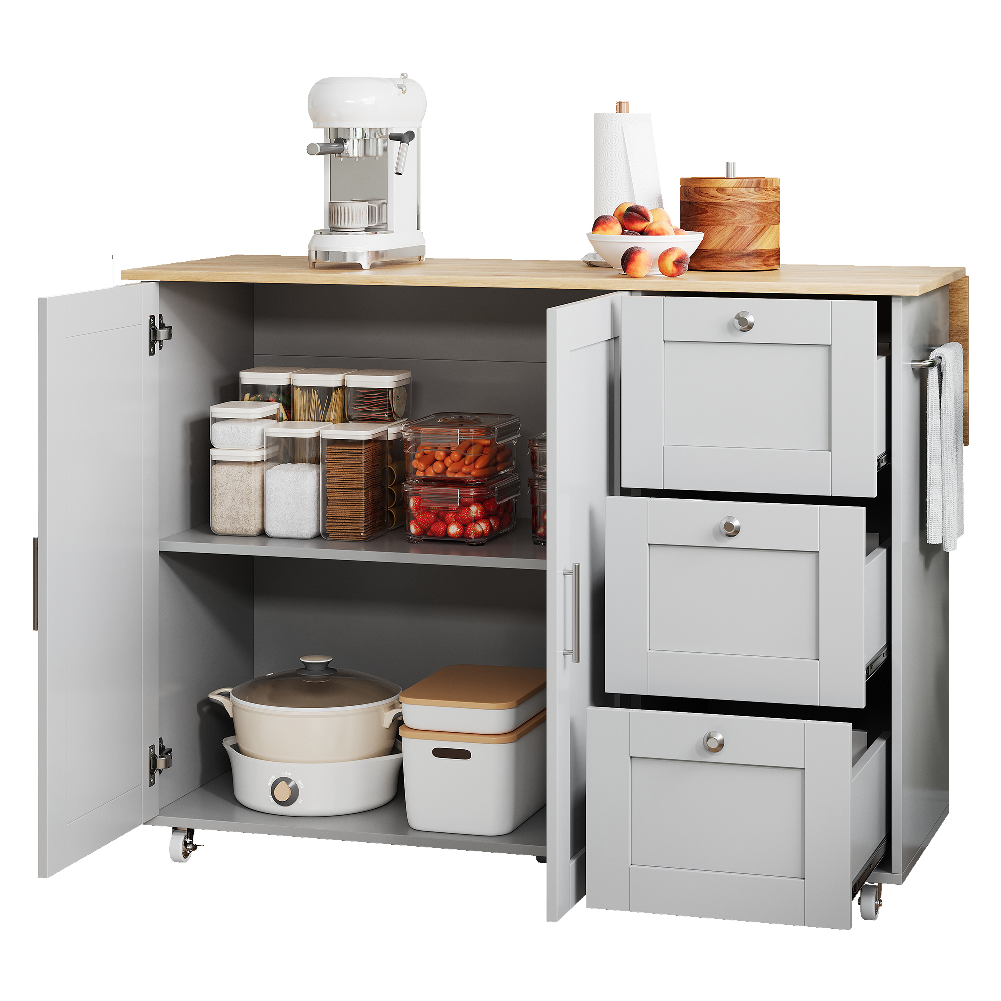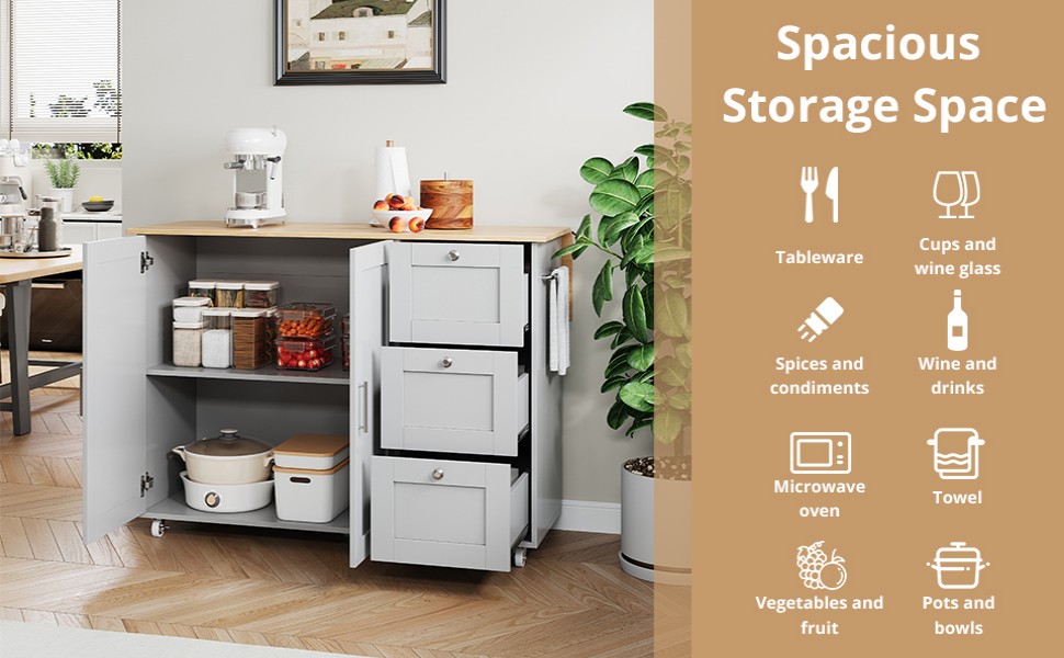 • Multifunctional storage: The double-door cabinet with adjustable shelves is perfect for small appliances such as microwaves and coffee makers. The three drawers on the right are equipped with silent sliding rails for storing tableware, spices, and other items, meeting a wide range of storage needs.