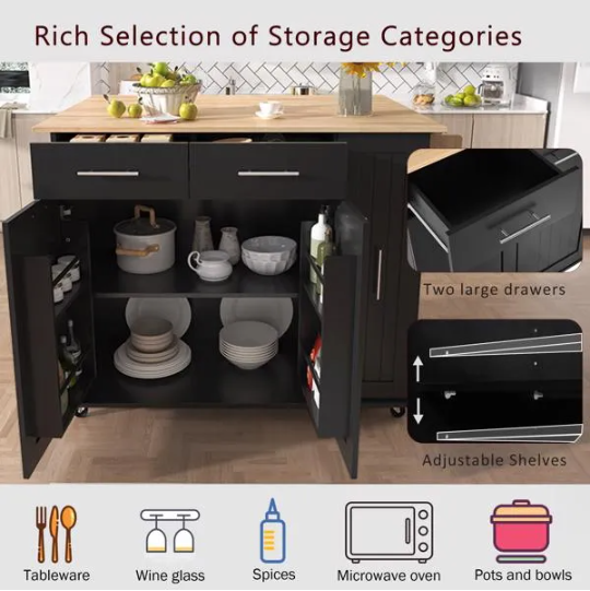 | Highlights | [Ample Storage Space][Drop Leaf][Two Doors + Two Drawers][Adjustable Shelves][Internal Storage Racks][3 Tier Pull Out Cabinet Organizer][5*360°Smooth Rotation Wheels with 2 Lockable][Towel Rack][Metal Handle][Soft-close Hinge][Eco-friendly manufactured MDF][Rubber Wood Countertop] |